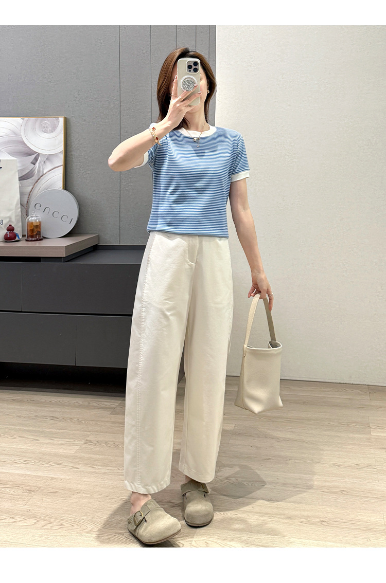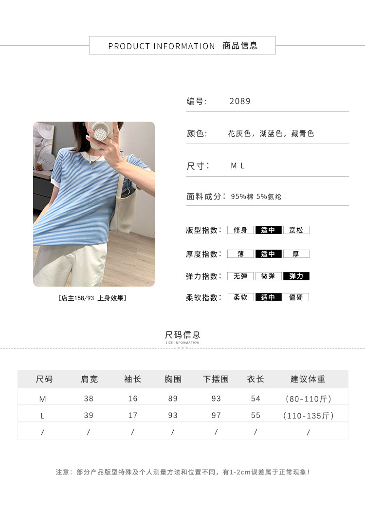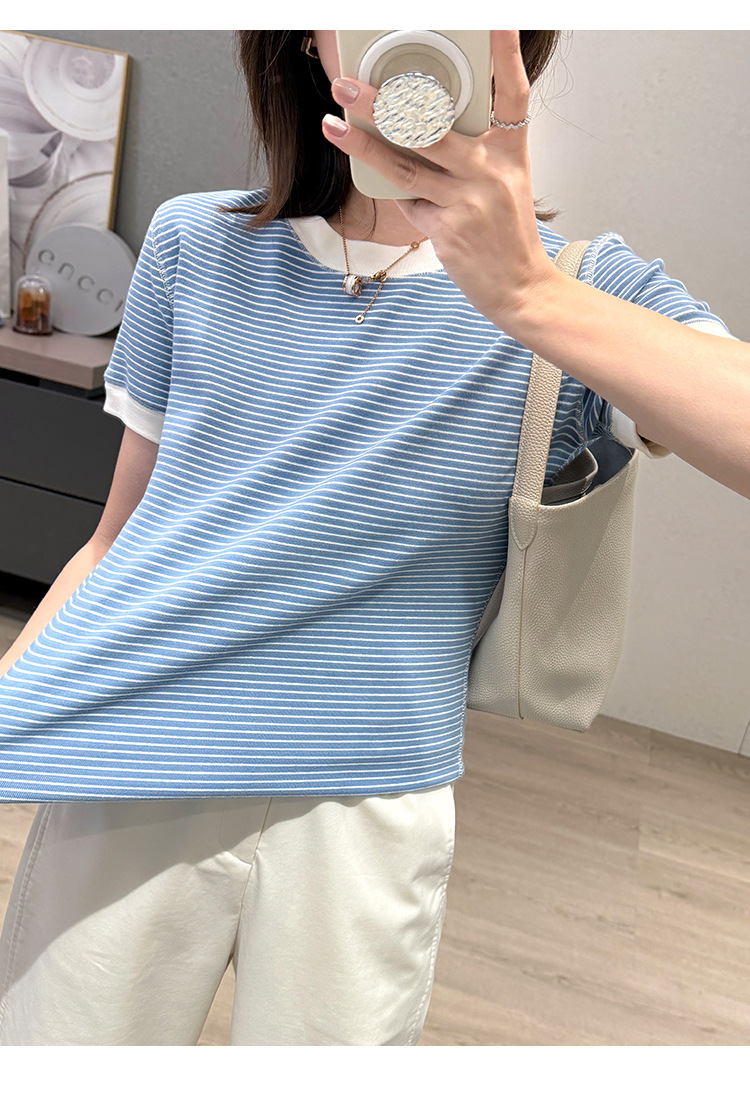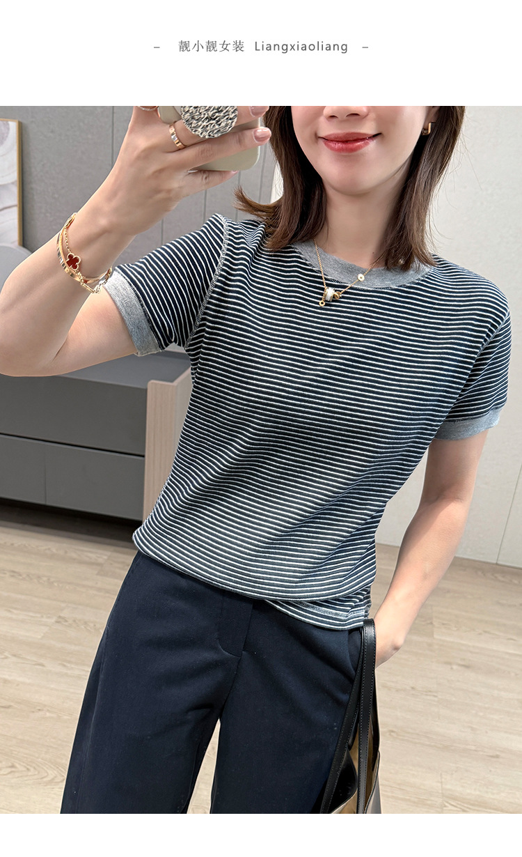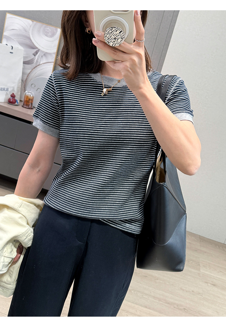 도니 DN 대비 색상 작은 줄무늬 화성 라인 짧은 소매 작은 티! 편안한 신장 면 둥근 목 짧은 어깨 탑스토어 가기