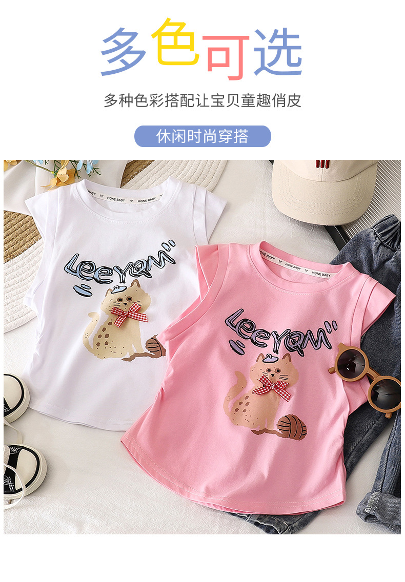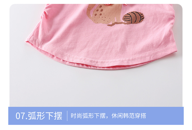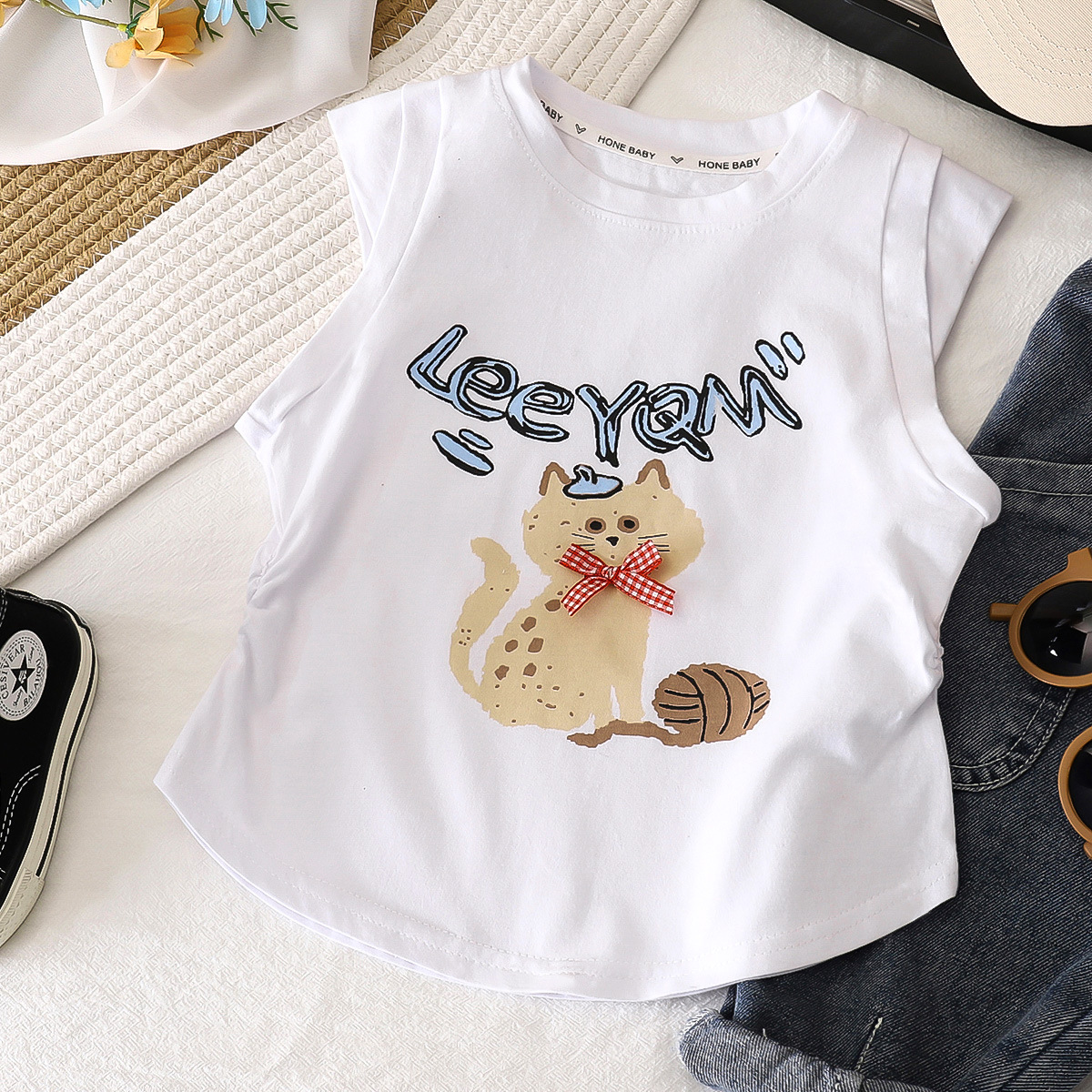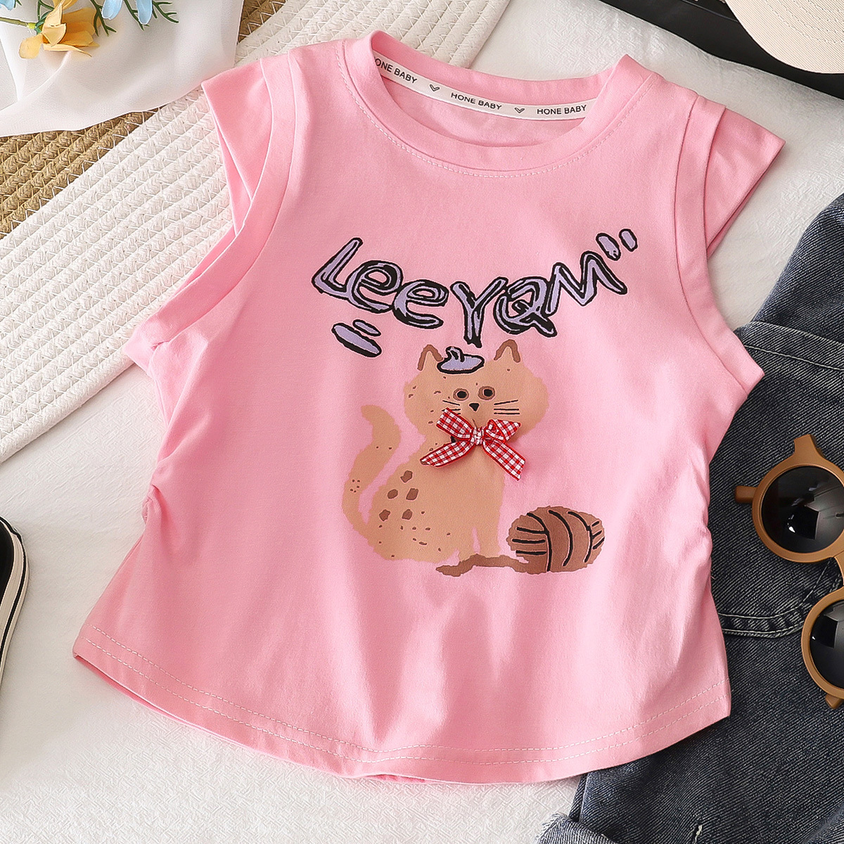2025 순수 코튼 소녀 티셔츠 아기 소녀 슬림 피트 플리츠 허리 탑 만화 티셔츠 조끼 반팔 귀여운 만화스토어 가기