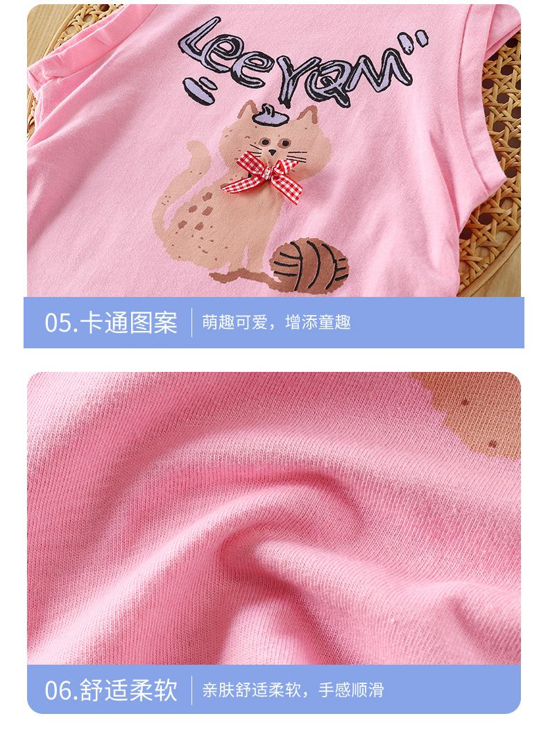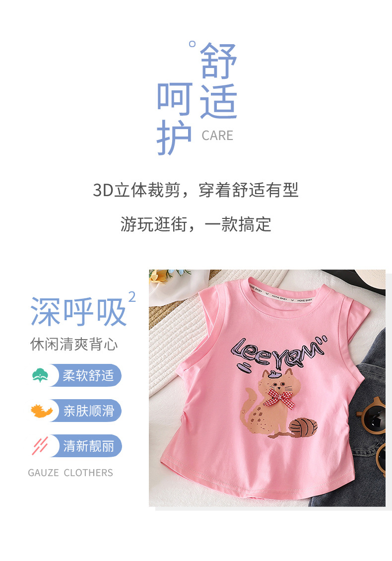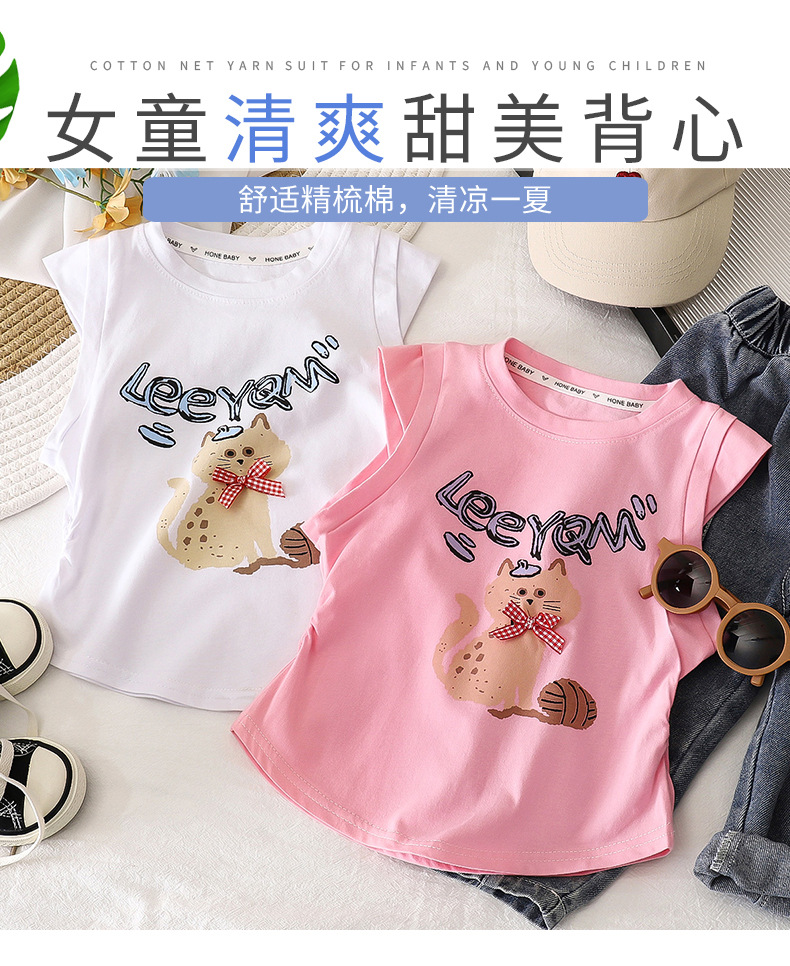 2025 순수 코튼 소녀 티셔츠 아기 소녀 슬림 피트 플리츠 허리 탑 만화 티셔츠 조끼 반팔 귀여운 만화