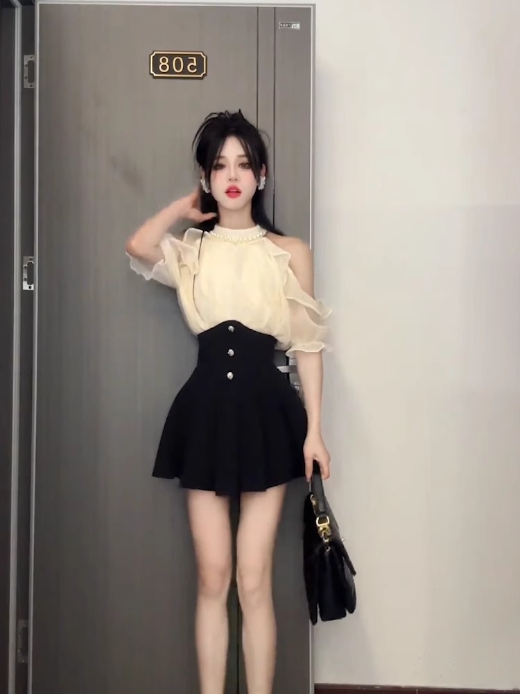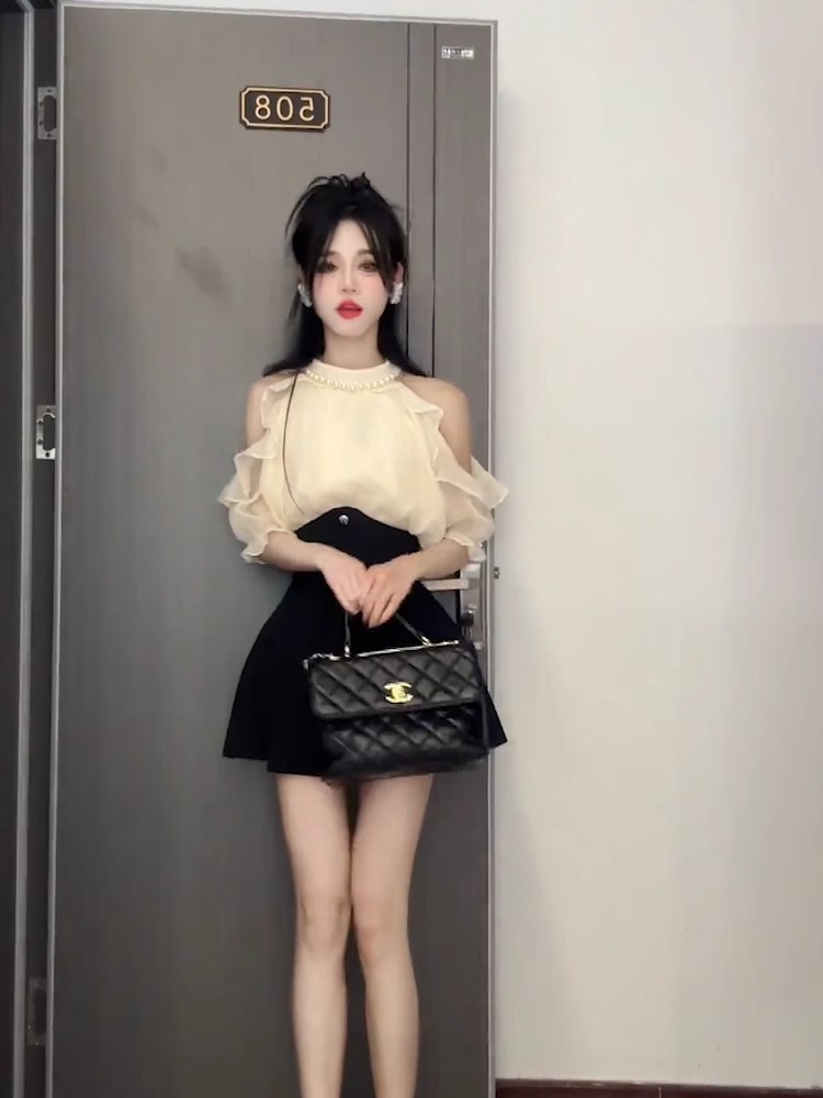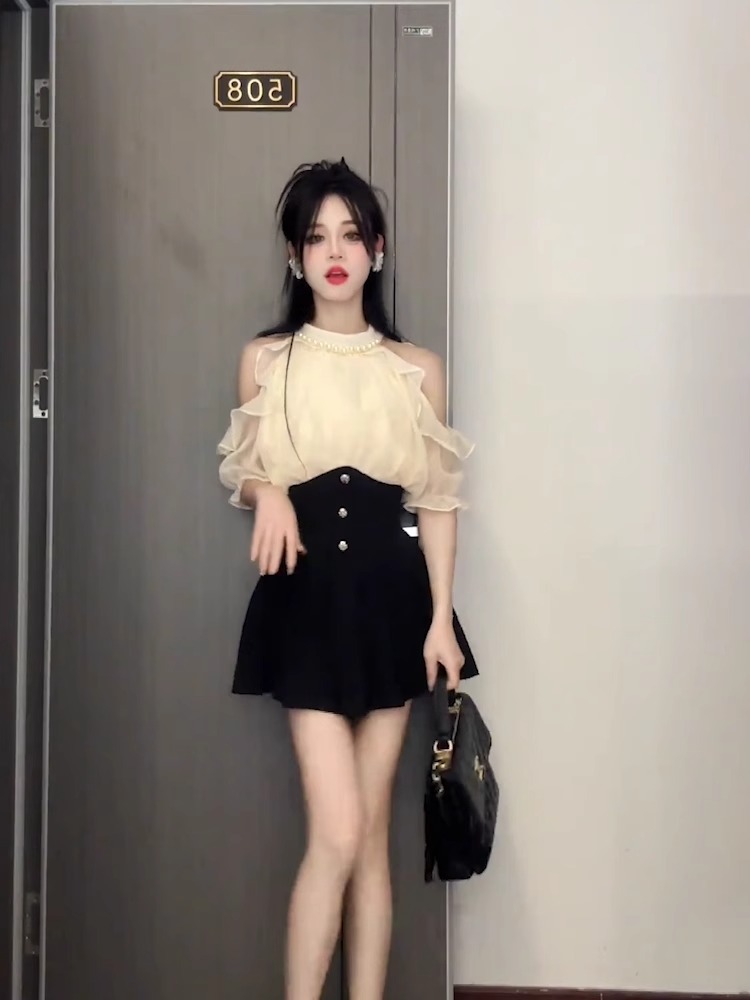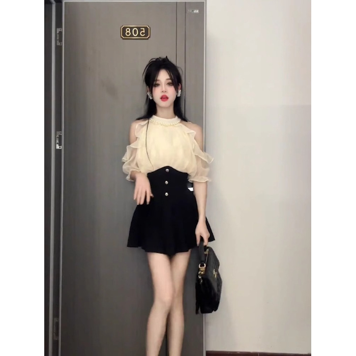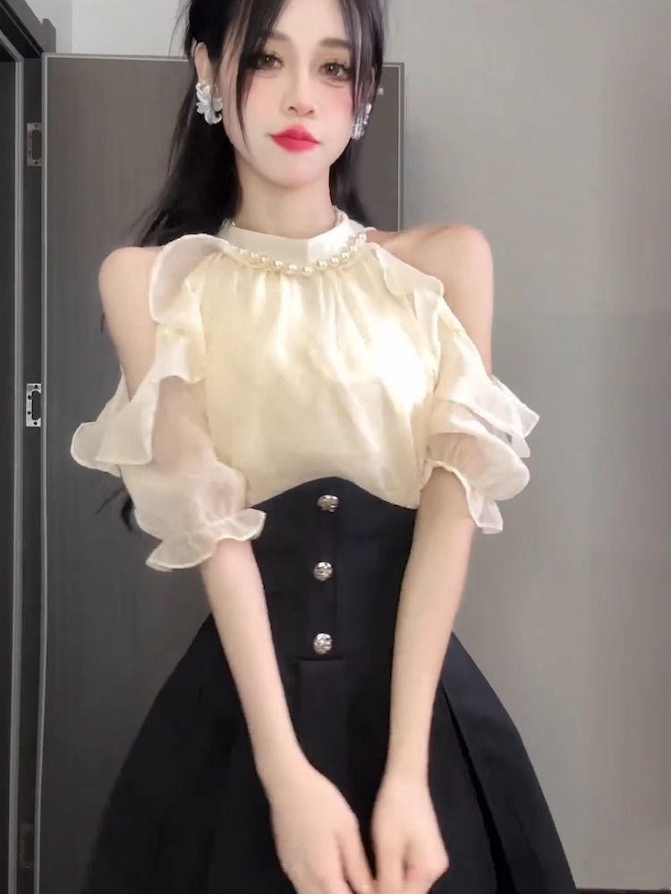 2025 여름 신형 진주 교수형 목 오프 숄더 우아한 밝은 실크 쉬폰 셔츠 여성용 타이트한 허리 쇼트 스커트 고급 투피스 세트스토어 가기