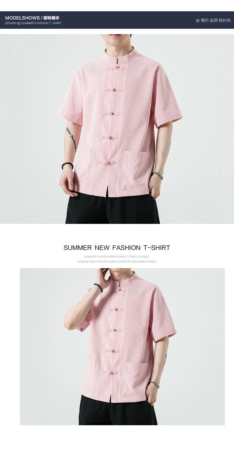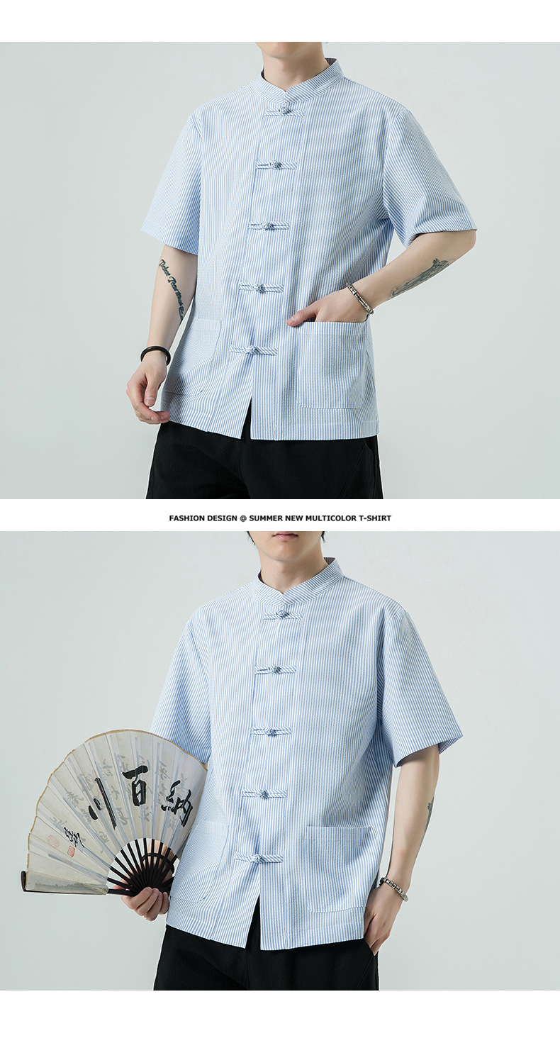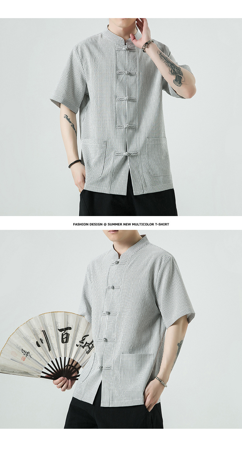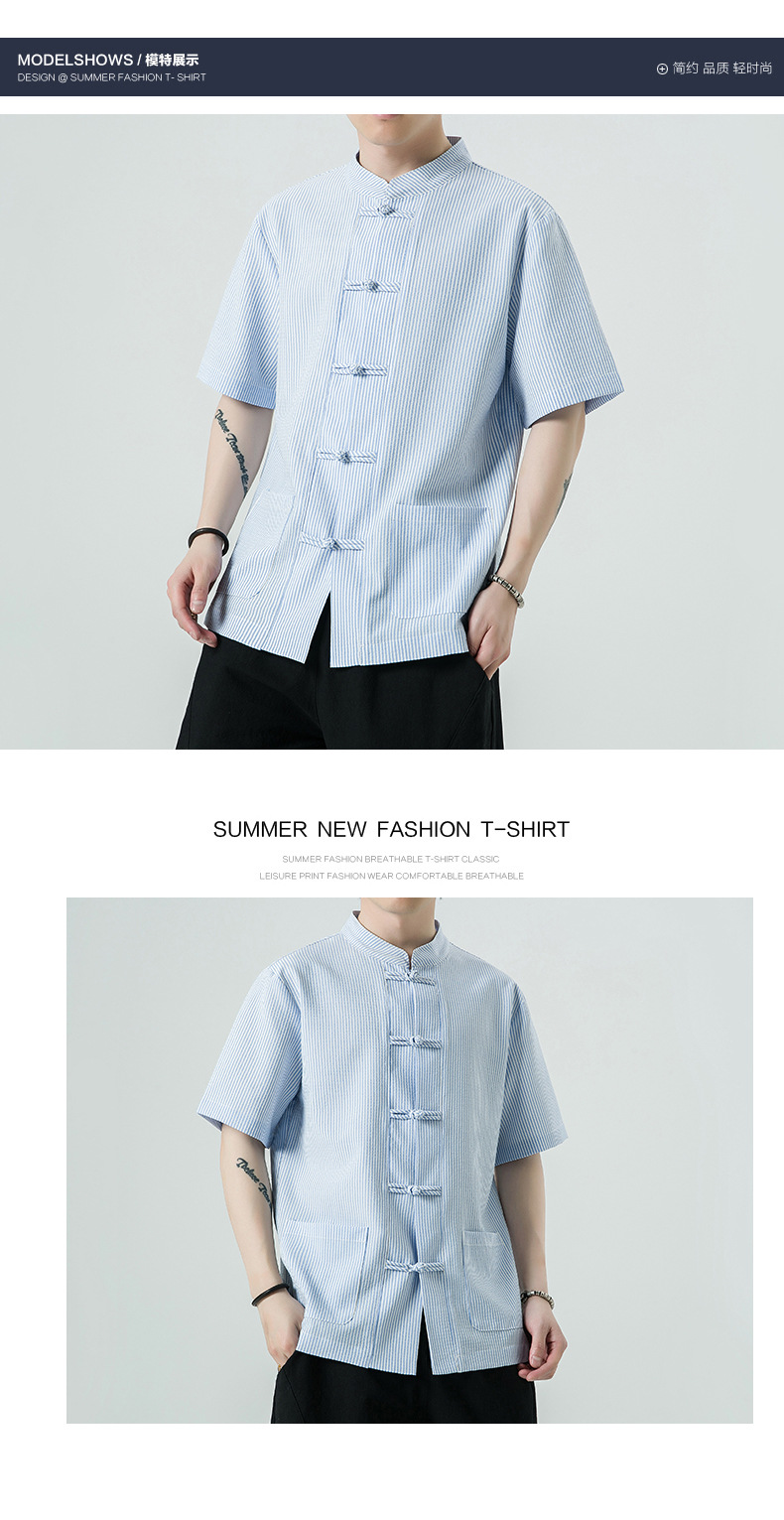 2023 여름 중국 스타일 코튼 리넨 스트라이프 반팔 셔츠 남자 일본식 플러스 사이즈 버튼 중국 당나라 원피스 셔츠스토어 가기