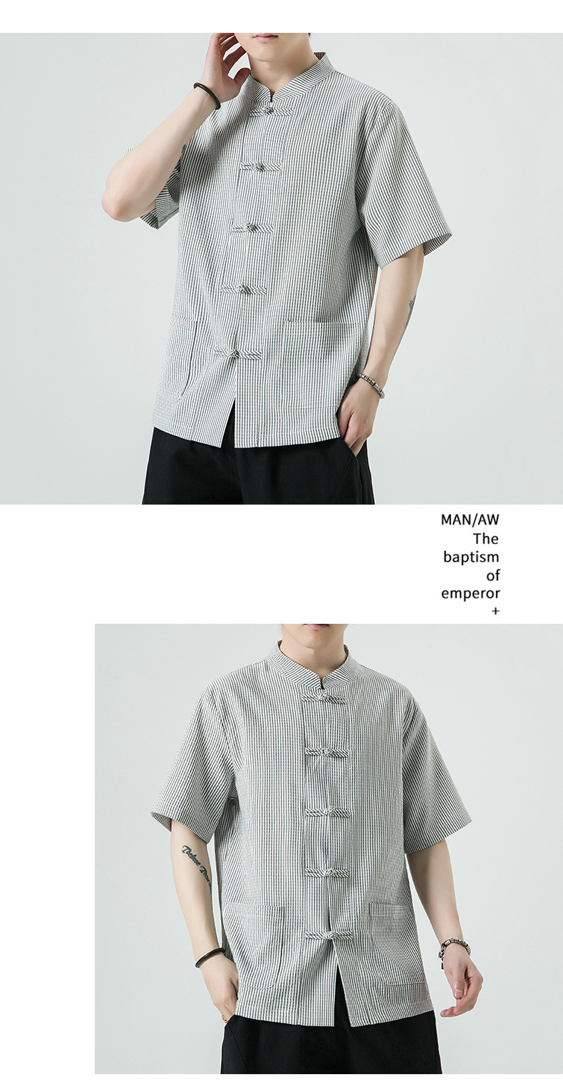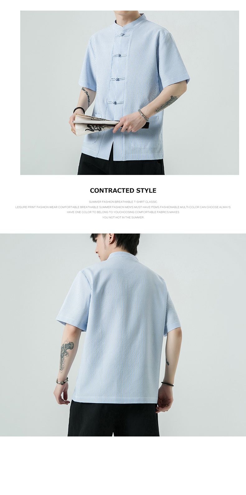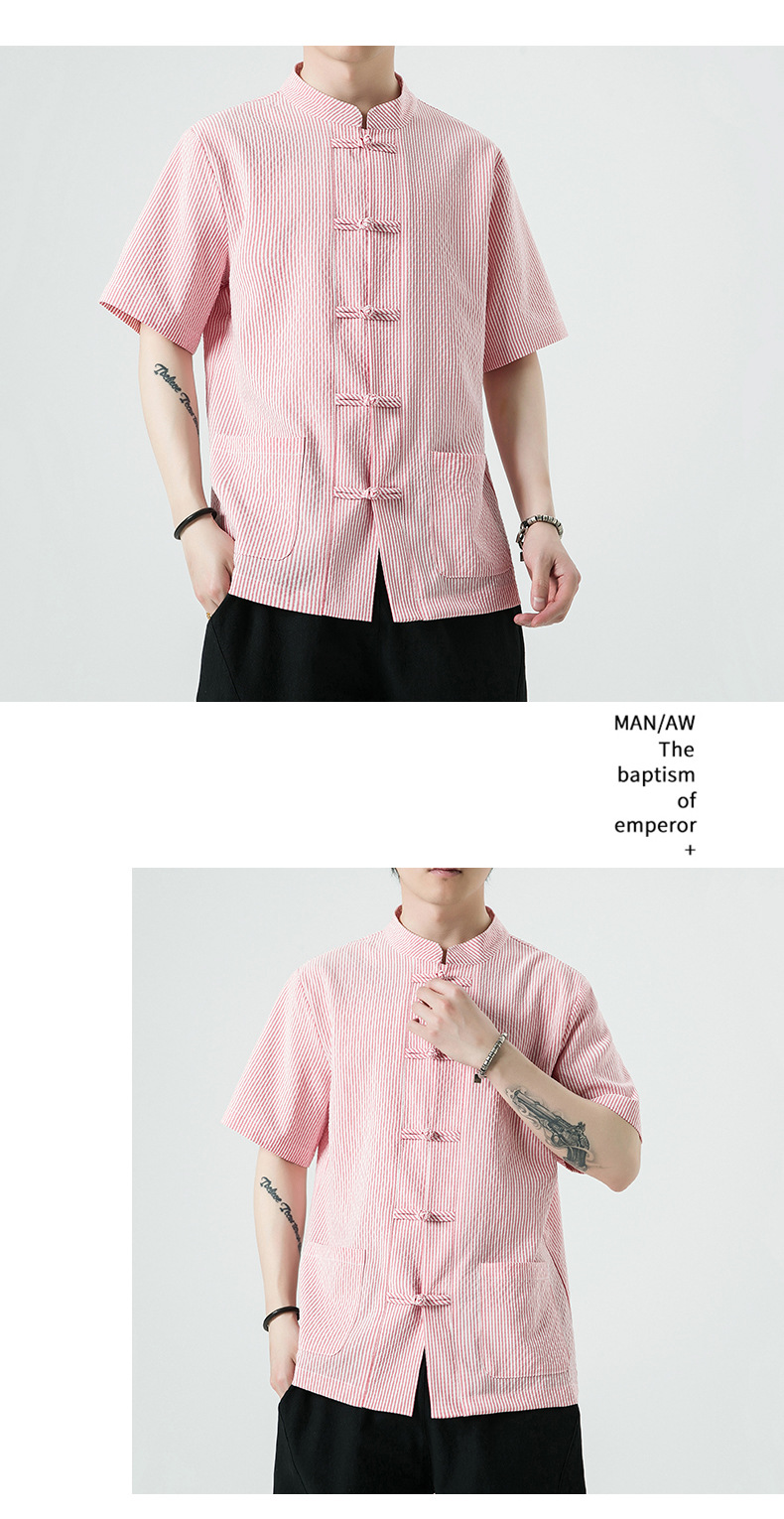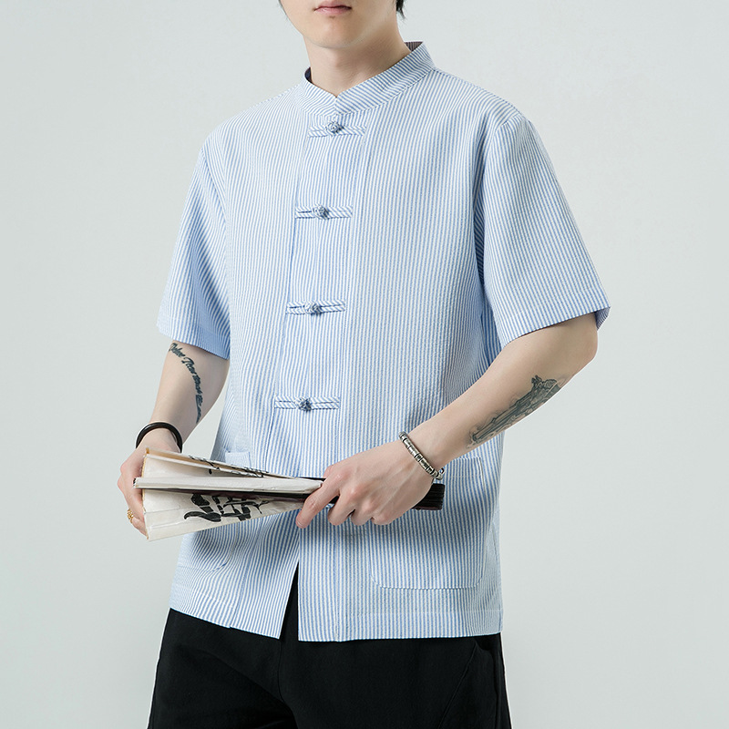 2023 여름 중국 스타일 코튼 리넨 스트라이프 반팔 셔츠 남자 일본식 플러스 사이즈 버튼 중국 당나라 원피스 셔츠스토어 가기