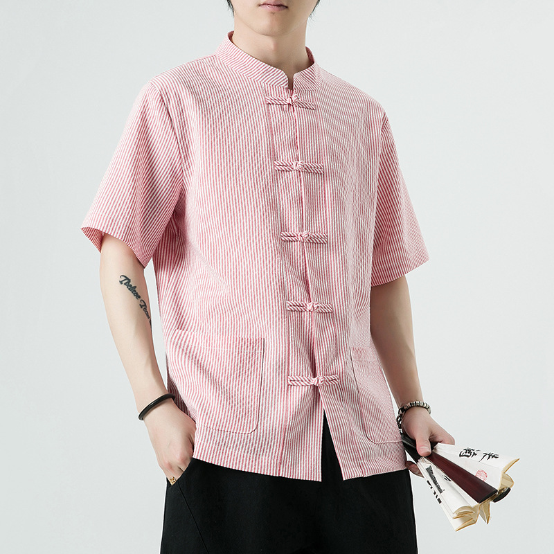 2023 여름 중국 스타일 코튼 리넨 스트라이프 반팔 셔츠 남자 일본식 플러스 사이즈 버튼 중국 당나라 원피스 셔츠
