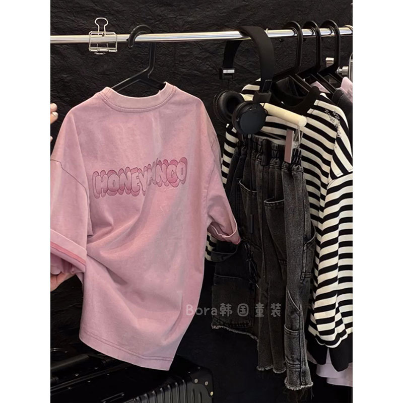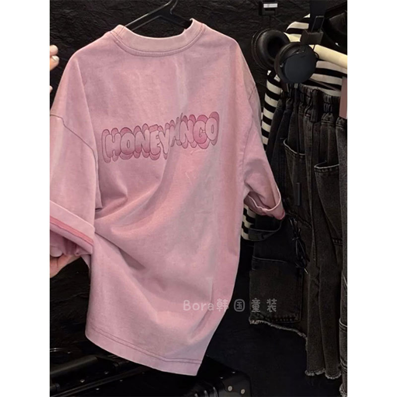 소년 반팔 티셔츠 2025 새로운 여름 어린이 트렌디 브랜드 프라이드 스트리트 티셔츠 빅 아동복 핑크 코튼 톱 6