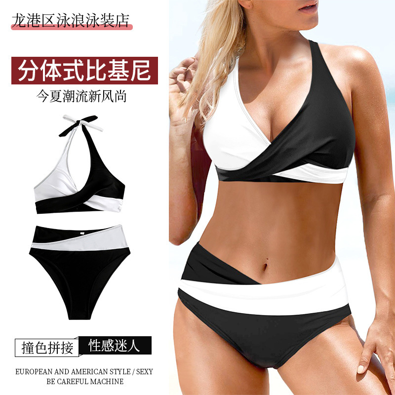 아마존 수영복 비키니 하이 웨이스트 섹시한 대외 무역 유럽과 미국의 국경 간 스플릿 여성 크로스 수영복 컬러 블록 비키니스토어 가기