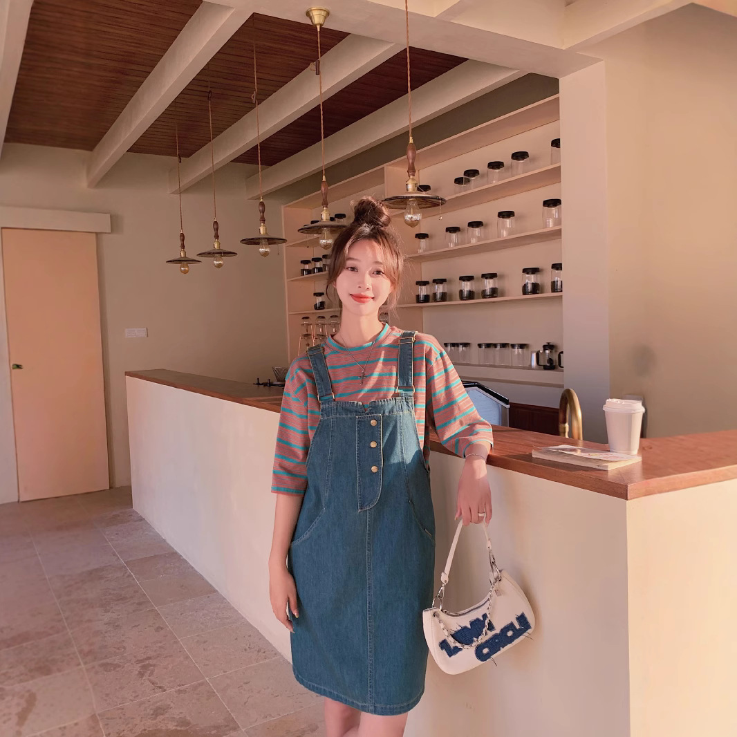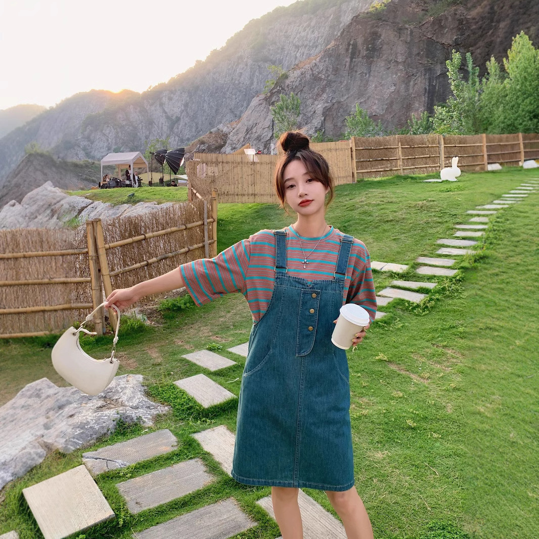 실제 샷 작은 데님 스트랩 스커트 세트 2025 새로운 게으른 바람 연령 감소 스트라이프 티셔츠 A 라인 스커트 투피스 세트