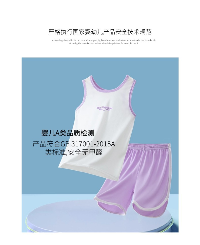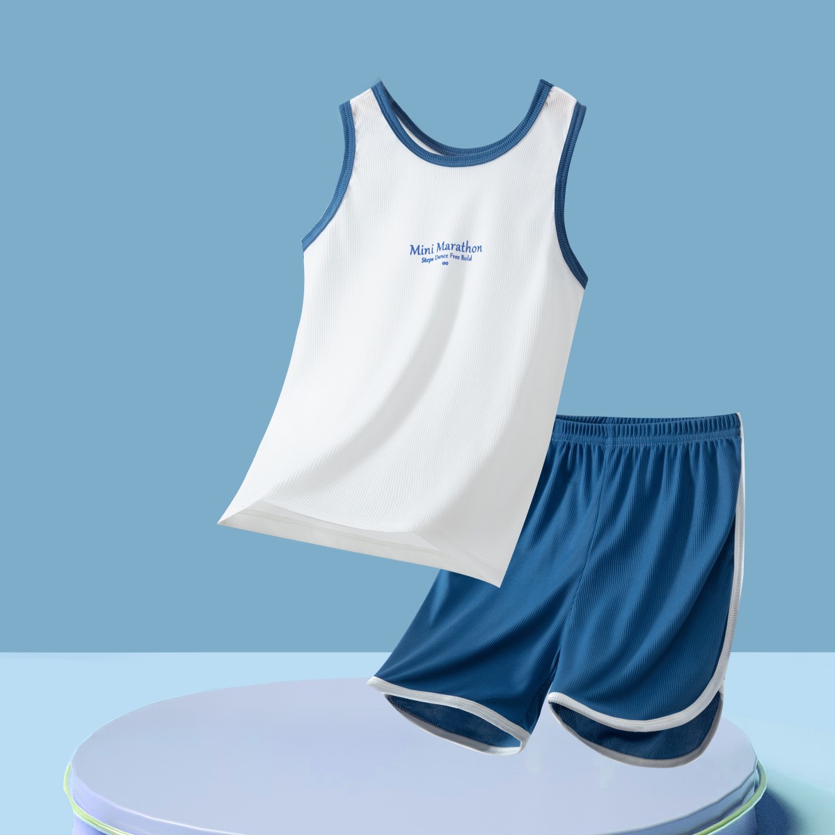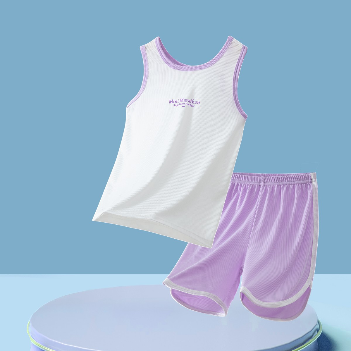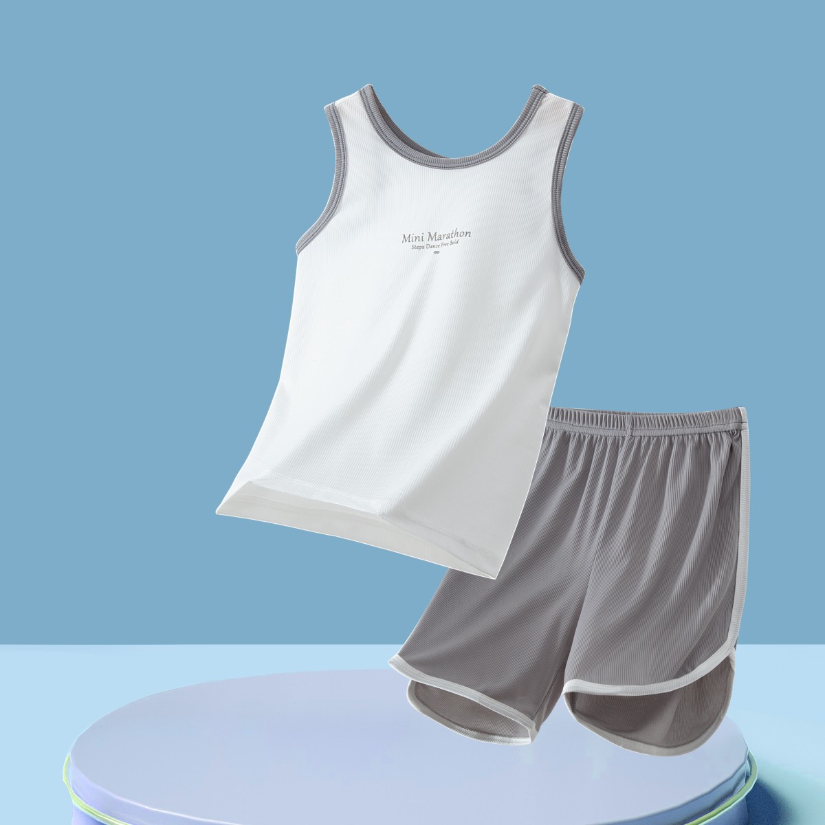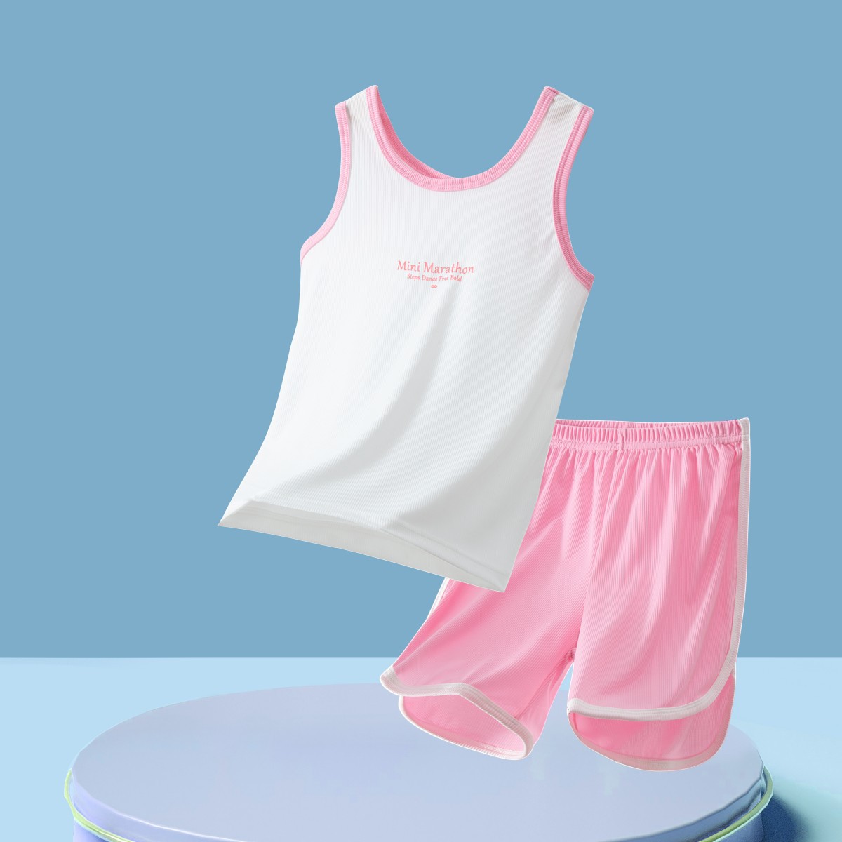 어린이 아이스 실크 조끼 세트 여름 새로운 컬러 블록 인쇄 조끼 세트 남학생과 여자를위한 민소매 통기성 홈 옷