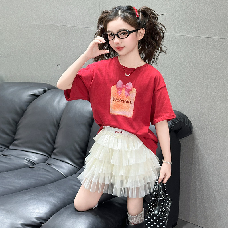 여자 세트 2025 여름 새 반팔 티셔츠 한국 루즈 캐주얼 대형 어린이 활 거즈 스커트 투피스 세트 T