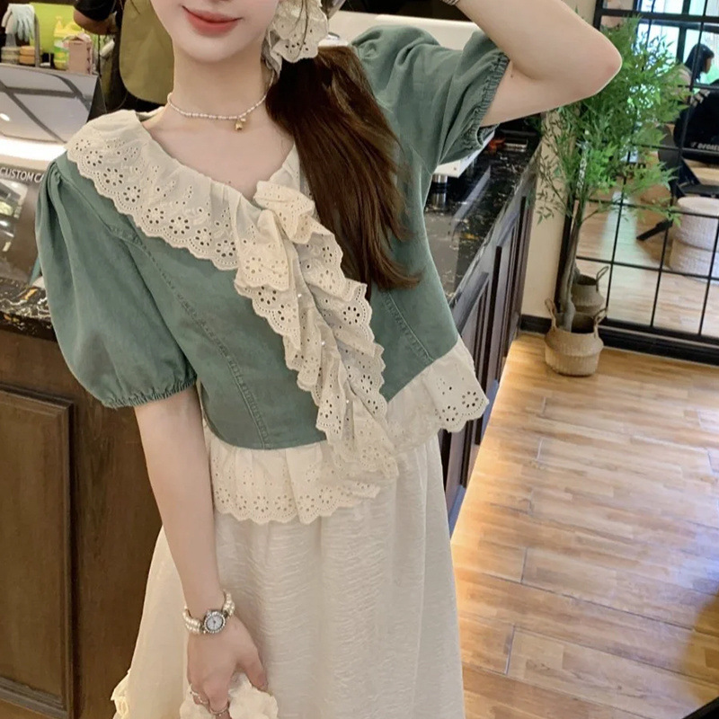 프랑스 스타일 레이스 바느질 반팔 데님 셔츠 여성용 여름 달콤한 시대-예쁜 셔츠 쉬폰 인형 칼라 탑