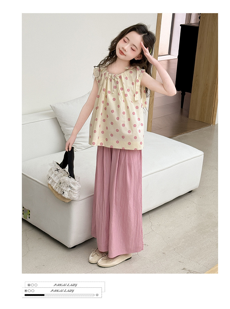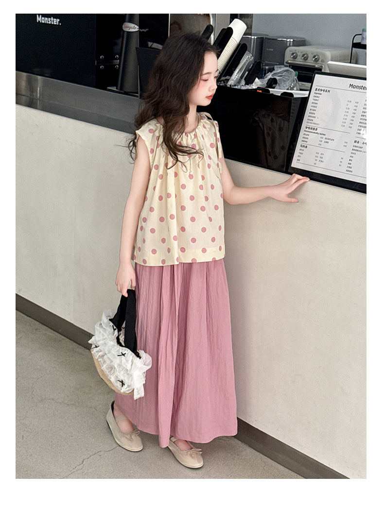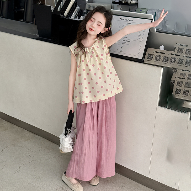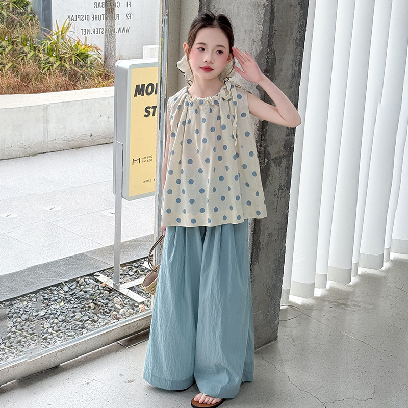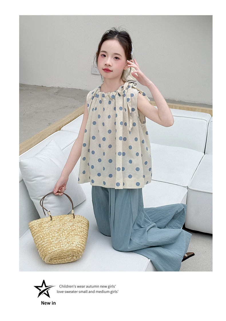 소녀 여름 새로운 민소매 티셔츠 어린이 폴카 도트 옷 서양식 소녀 느슨한 큰 아이를 세트 어린이 의류