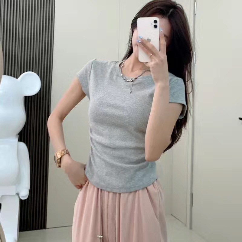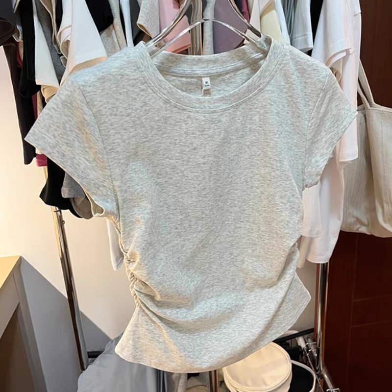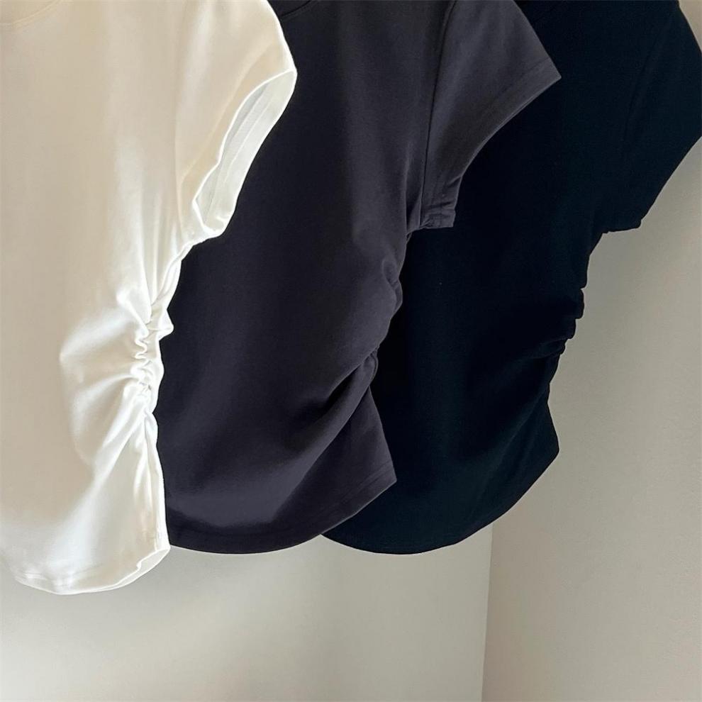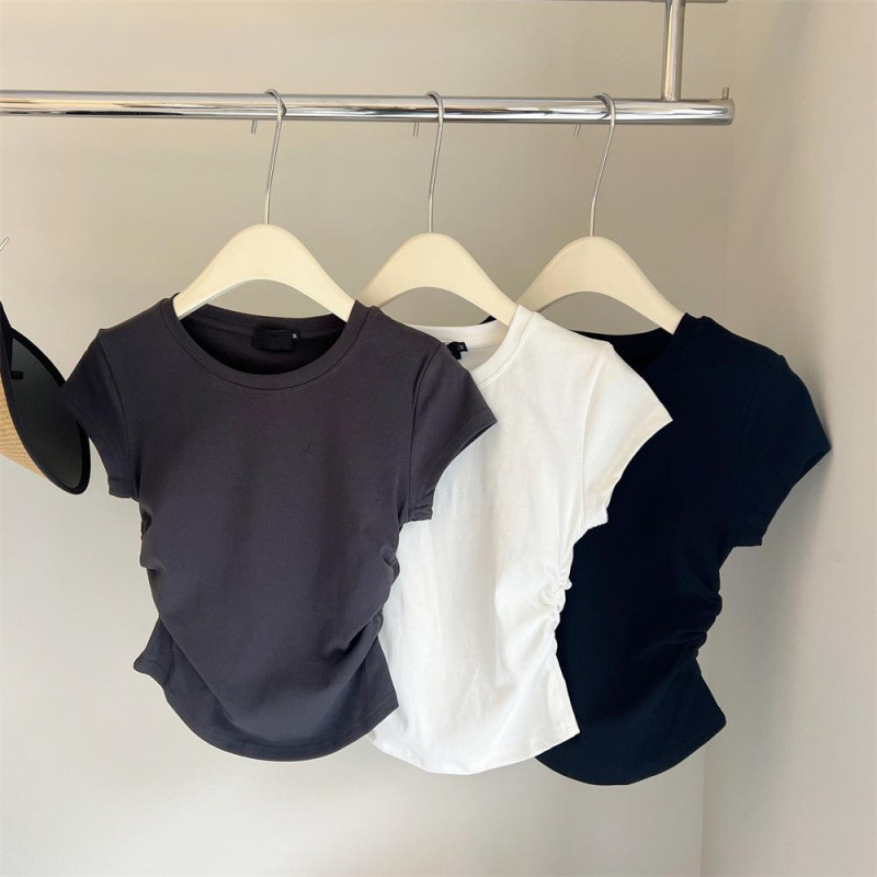 2024 여름 새로운 슬림 핏 슬리밍 짧은 색상 주름 디자인 크루 넥 심플 스타일 반팔 셔츠 탑스토어 가기