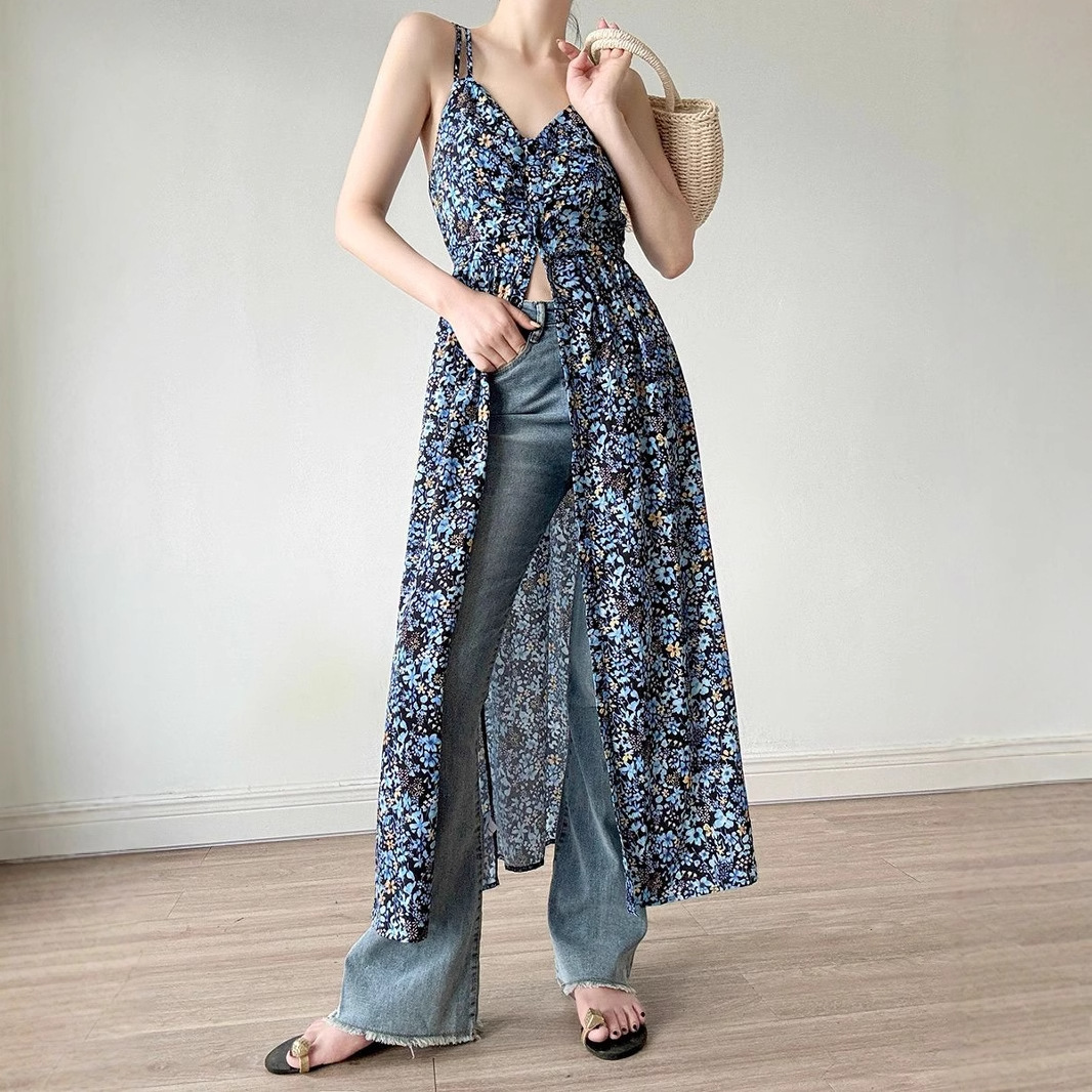 2025 여름 새로운 해변 휴가 꽃-꽃 슬링 긴 원피스 차 브레이크 프랑스 고급 세련된 원피스 여성