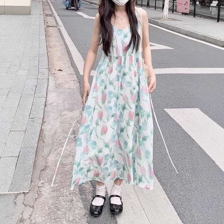 프랑스 스타일 첫사랑 휴일 해변 꽃 Halter 원피스 여성의 새로운 달콤한 우아한 헤일로 우아한 중간 길이 원피스스토어 가기