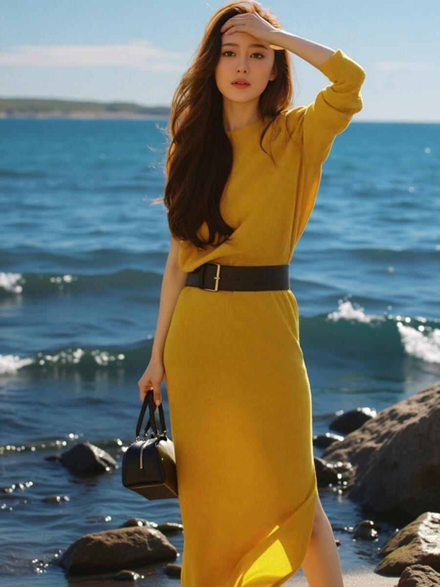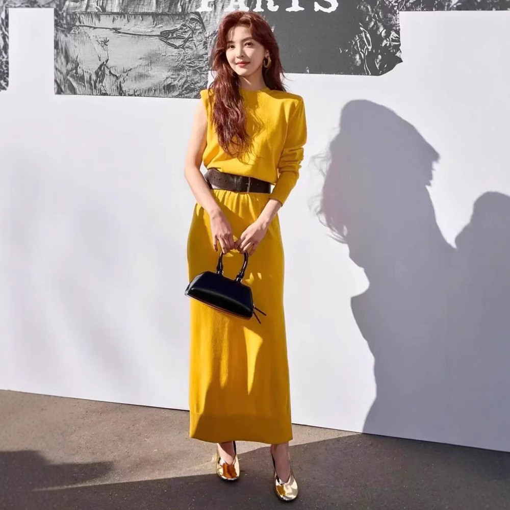 Zhang Ruonan 같은 스타일 디자인 센스 기질 아름다운 긴 원피스 노란색 비대칭 분할 니트 원피스 어린이 봄스토어 가기