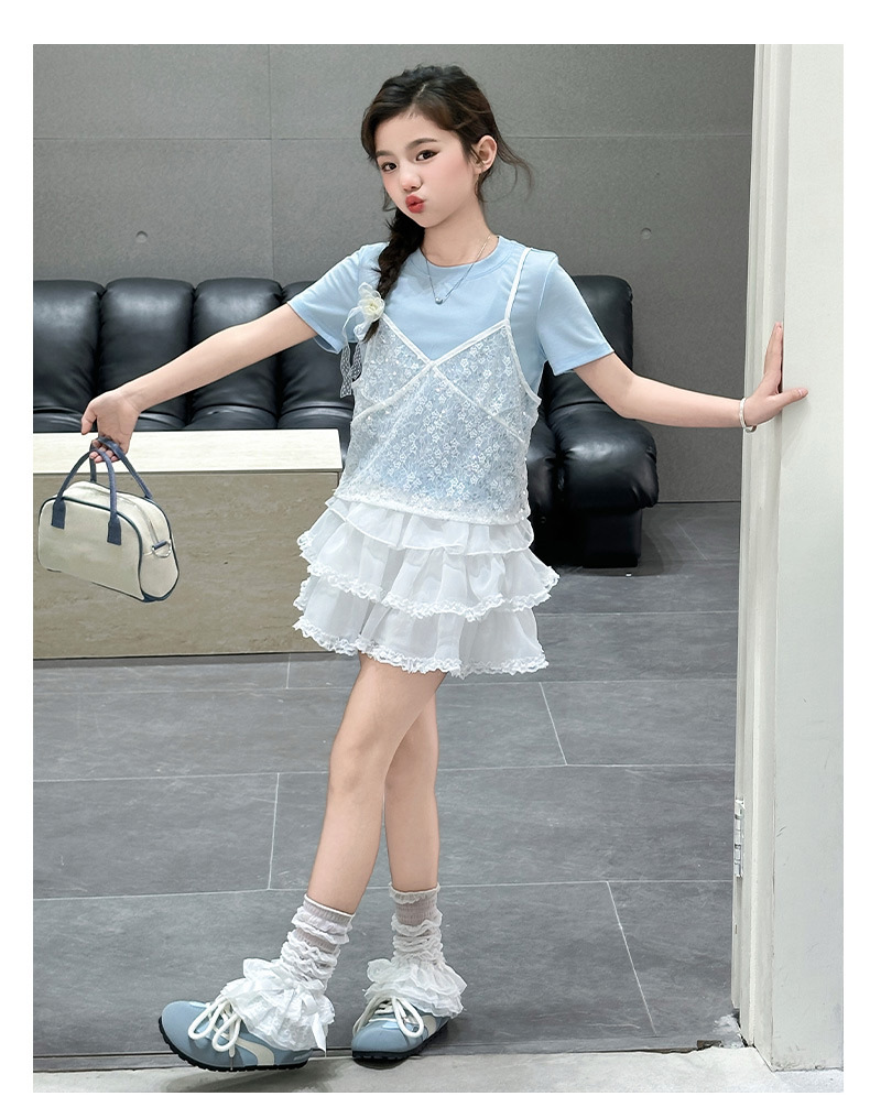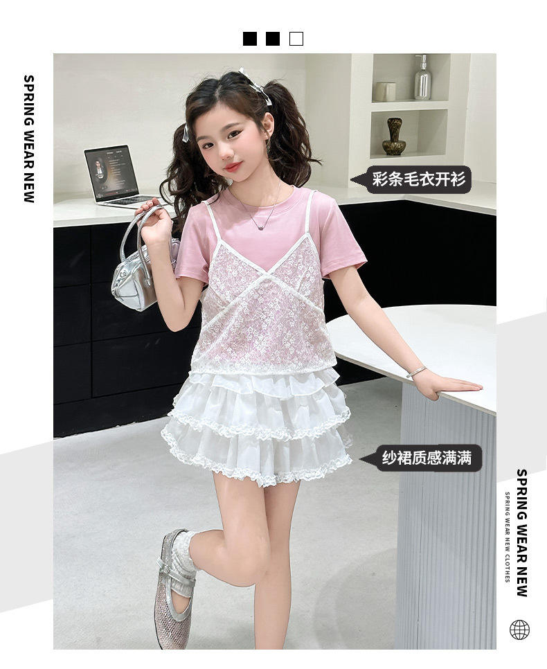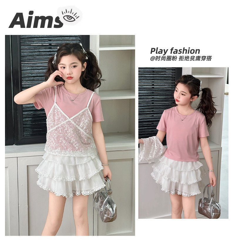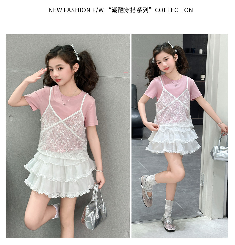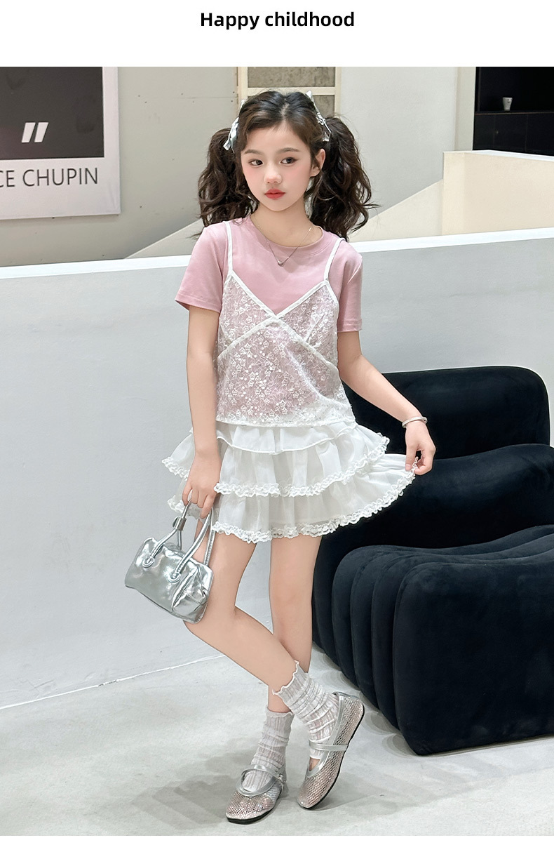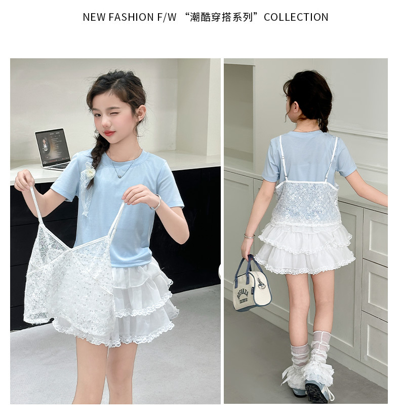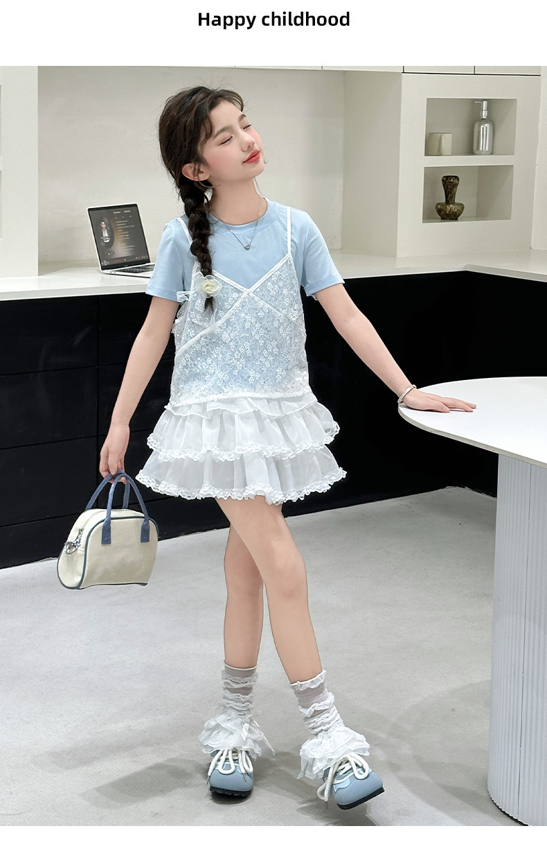 여자 세트 2025 여름 새로운 패션 서양 스타일 아기 소녀 달콤한 레이스 반팔 치마스토어 가기