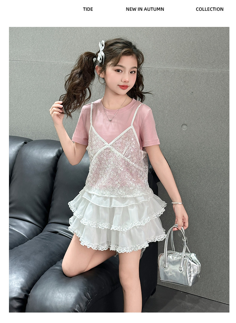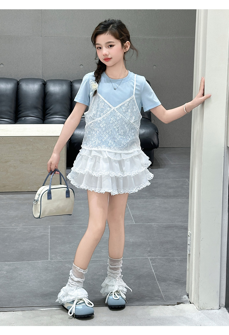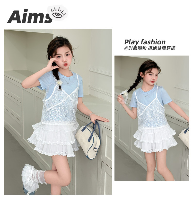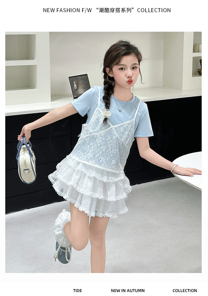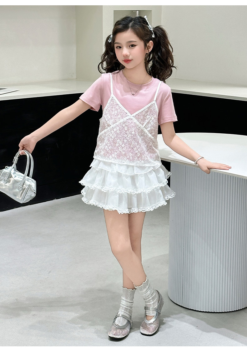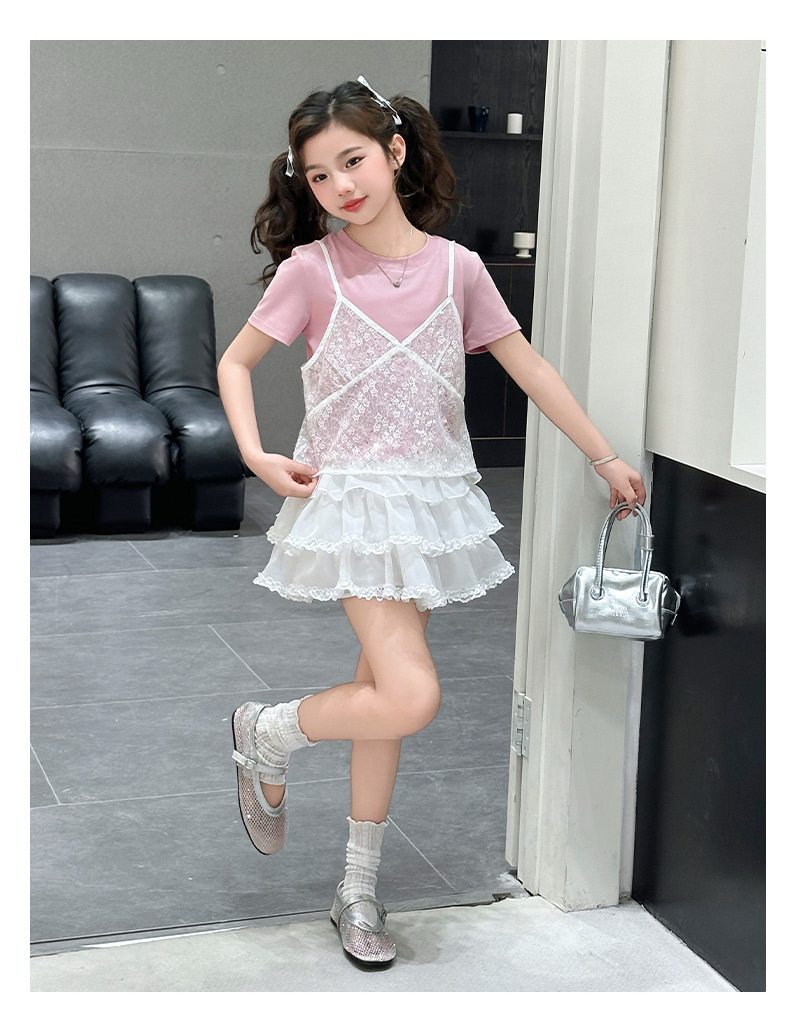 여자 세트 2025 여름 새로운 패션 서양 스타일 아기 소녀 달콤한 레이스 반팔 치마스토어 가기