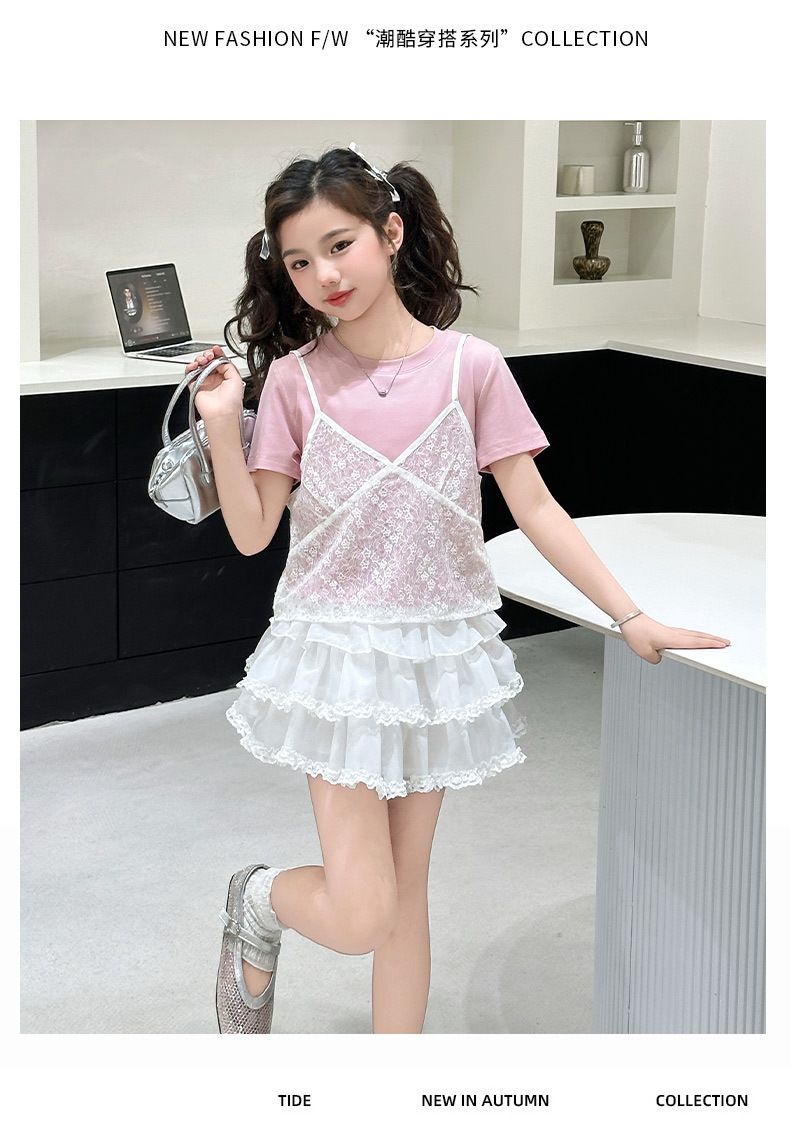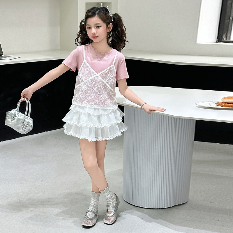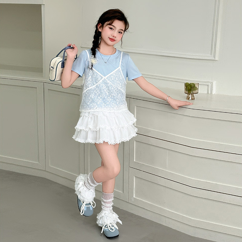 여자 세트 2025 여름 새로운 패션 서양 스타일 아기 소녀 달콤한 레이스 반팔 치마