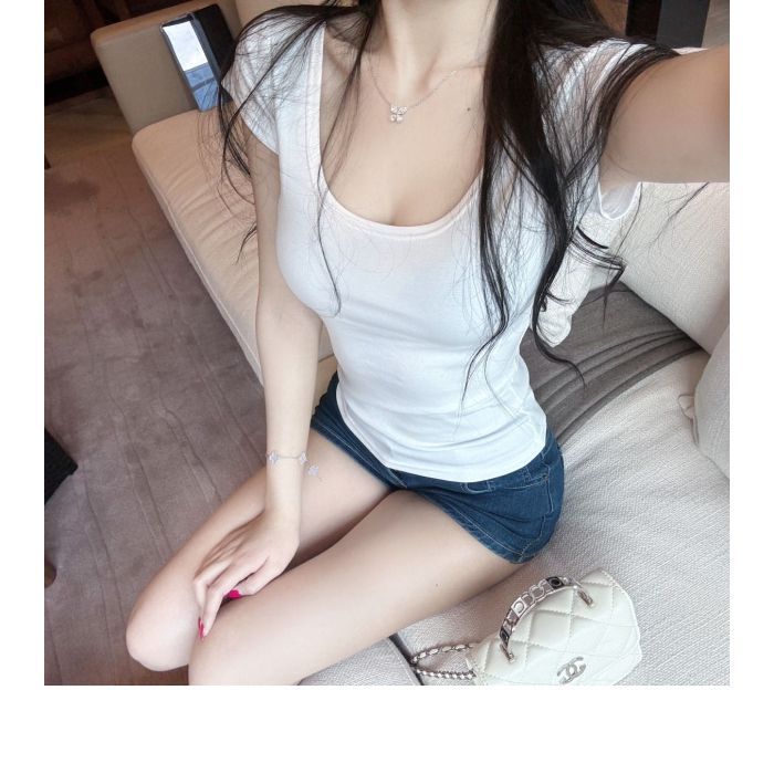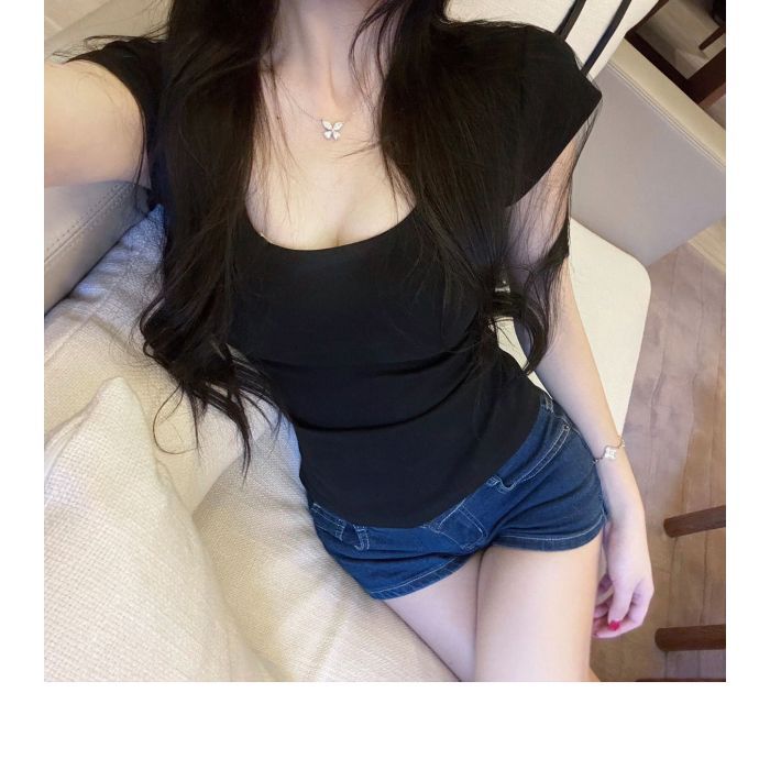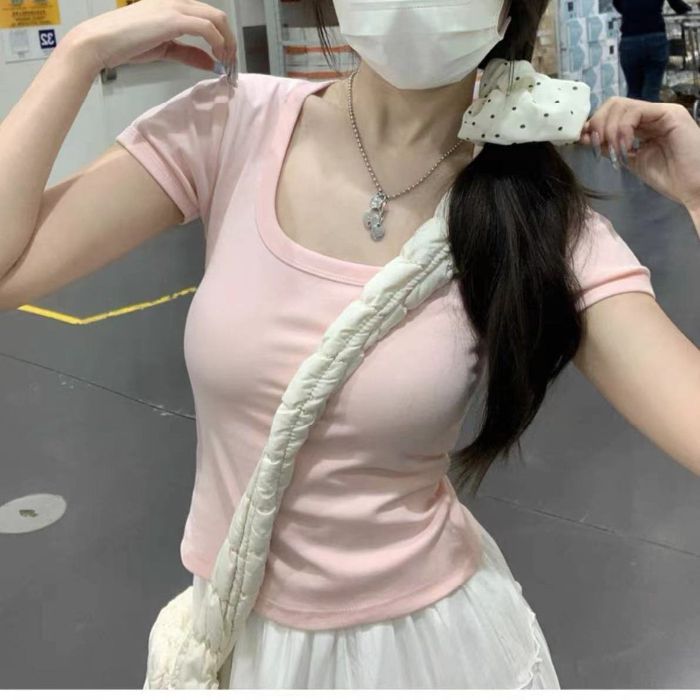 순수한 스파이스 소녀 U-칼라 반팔 티셔츠 여성의 여름 2025 새로운 차 예술 단단한 허리 숨겨진 블루 로우 칼라 탑