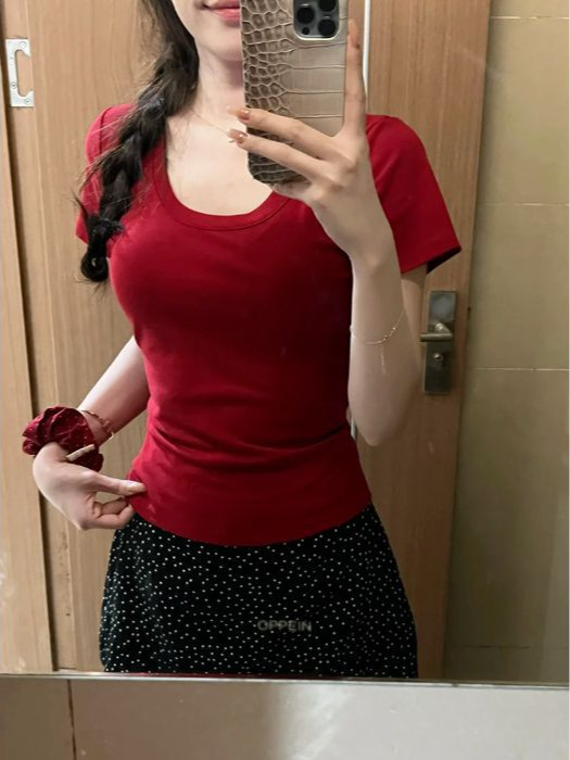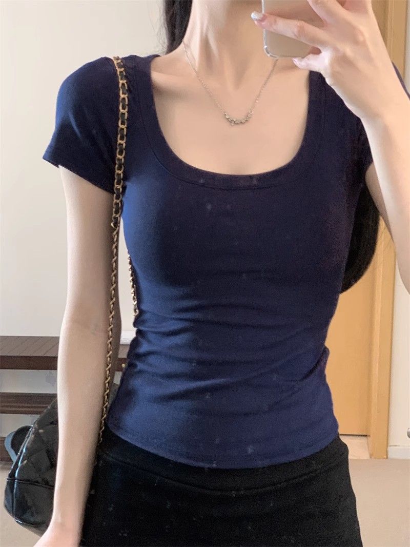 순수한 스파이스 소녀 U-칼라 반팔 티셔츠 여성의 여름 2025 새로운 차 예술 단단한 허리 숨겨진 블루 로우 칼라 탑스토어 가기