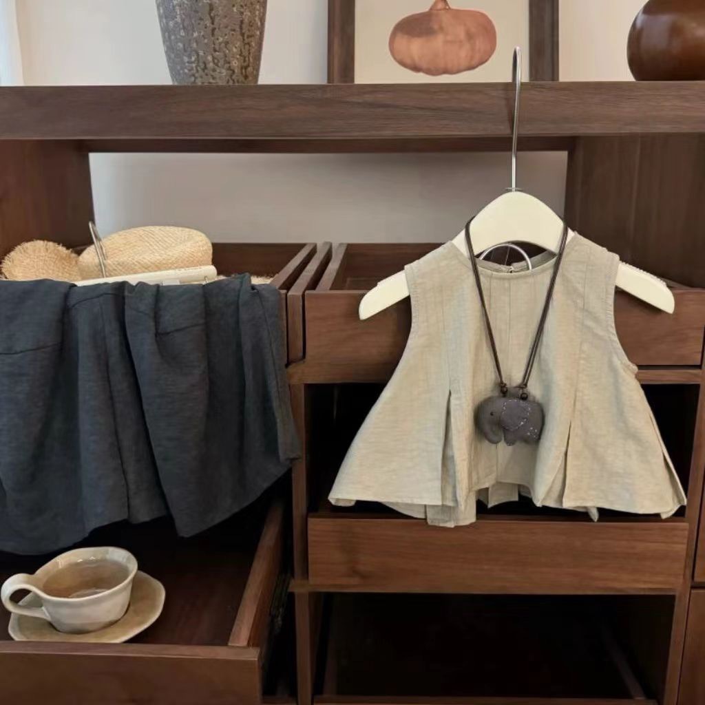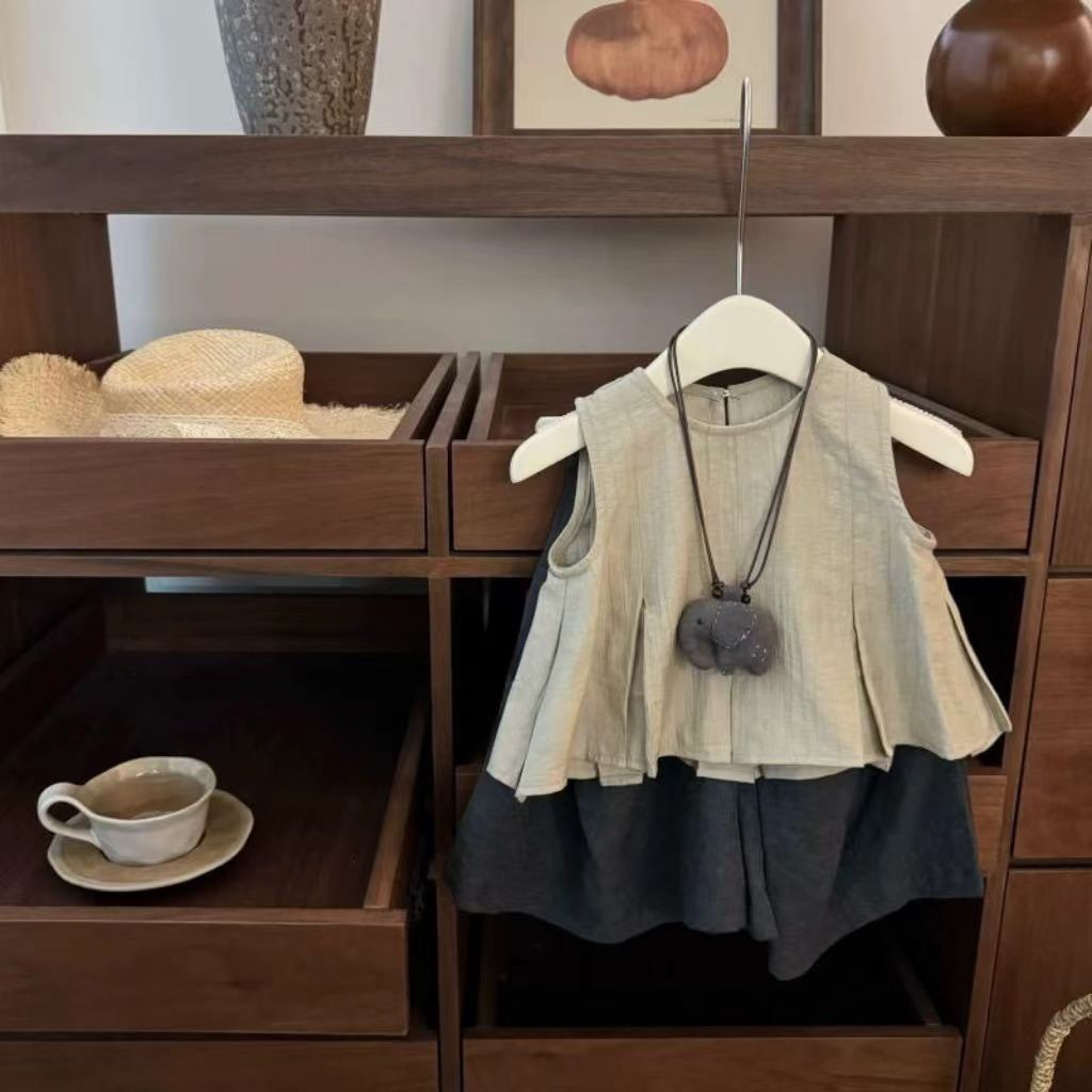 휴식의 감각! 아기 소녀의 주름 조끼 탑 그레이 프로필 느슨한 바지 외국식 세트스토어 가기