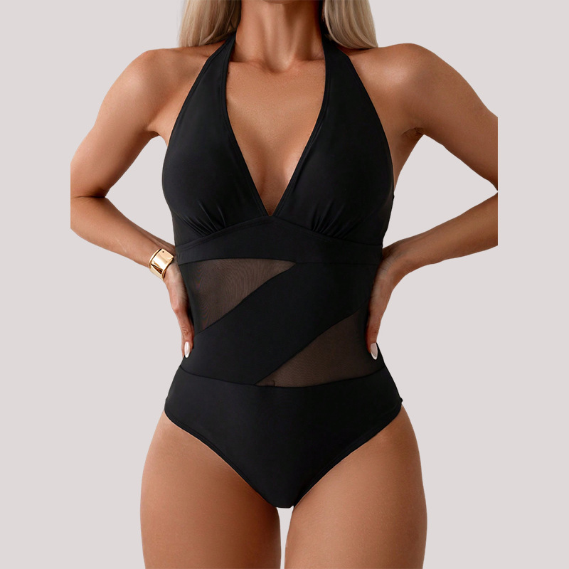 유럽과 미국의 새로운 스타일 메쉬 스티치 삼각형 원피스 수영복 여성용 작은 가슴용 끈이 있는 배를 가려주는 슬림하고 섹시한 수영복