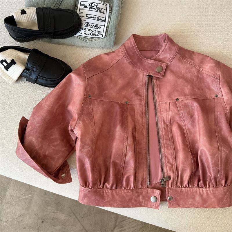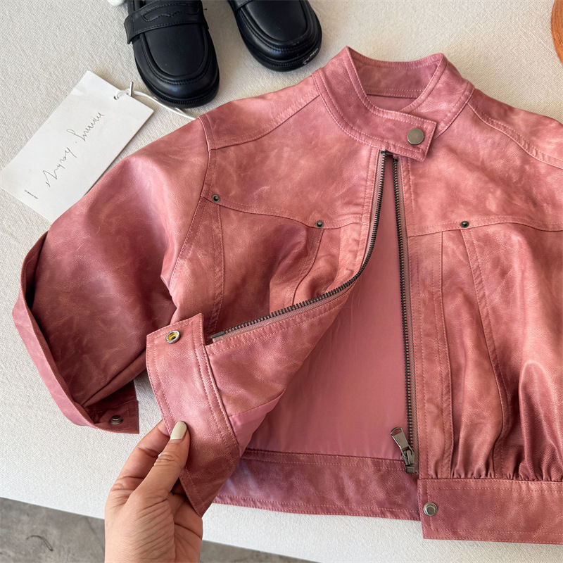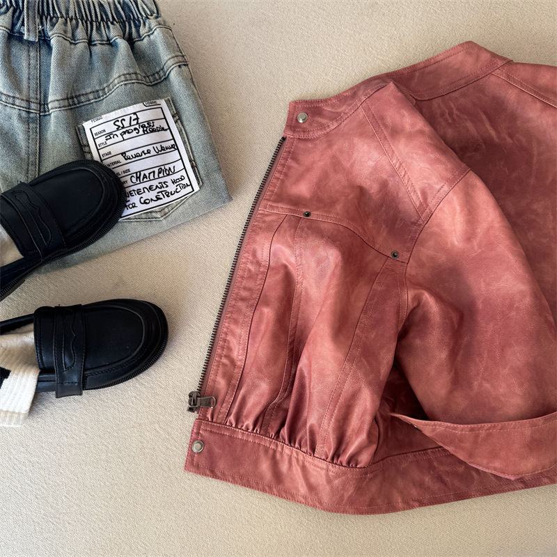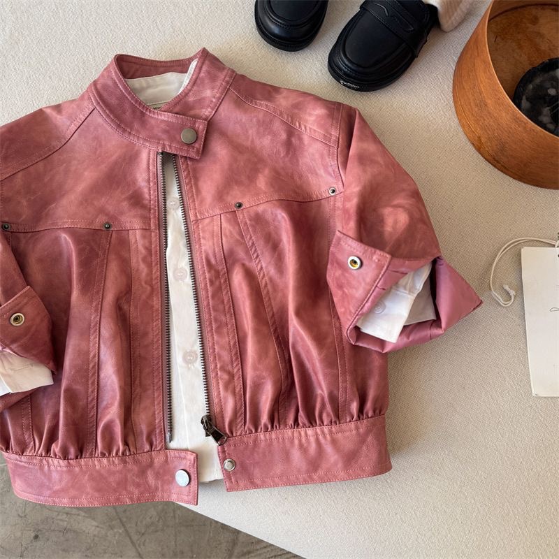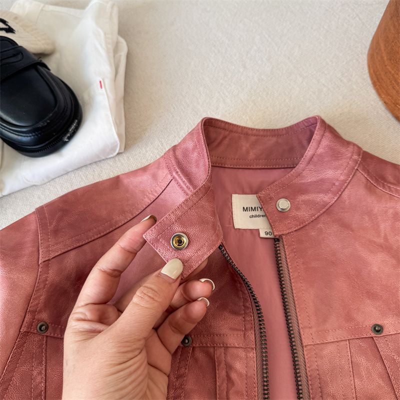어린이 코트 2025 새로운 봄 소년과 소녀 솔리드 컬러 지퍼 가죽 코트 아기 한국 가죽 자켓 트렌디