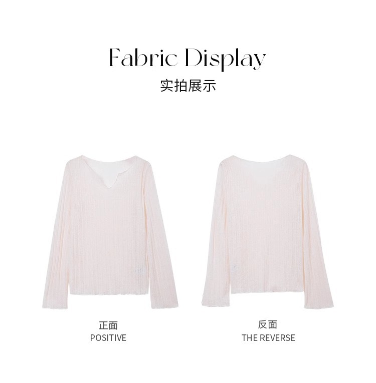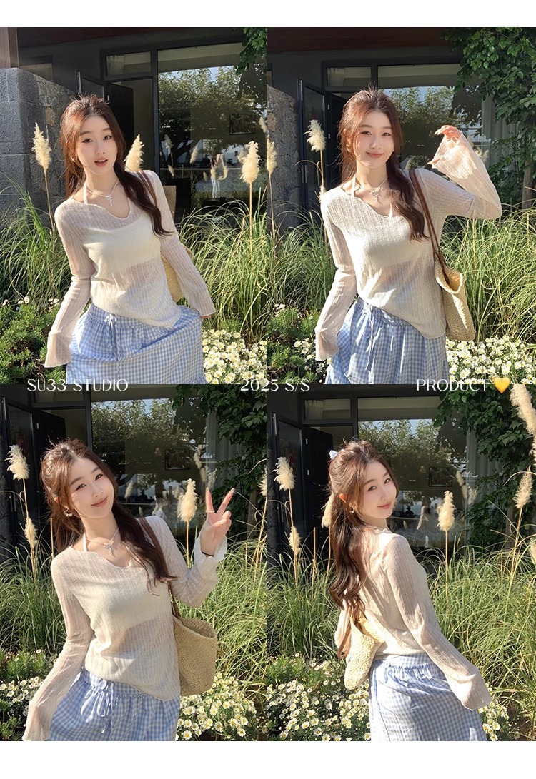 해변 선 스크린 블라우스 얇은 긴팔 여자 2025 년 여름 새로운 V 넥 루즈 올 매치 니트 숄더 탑