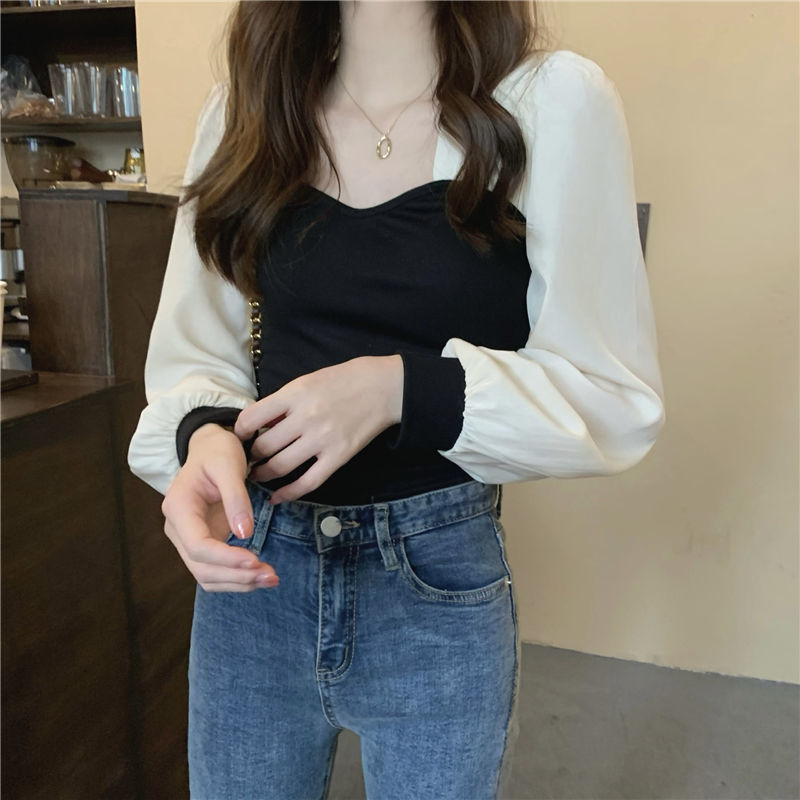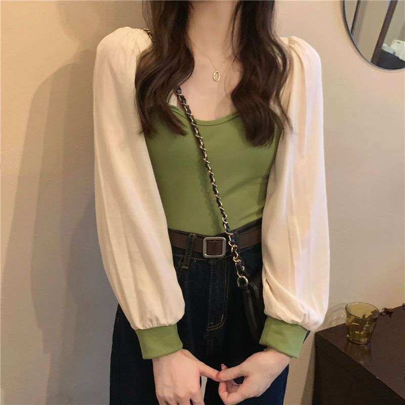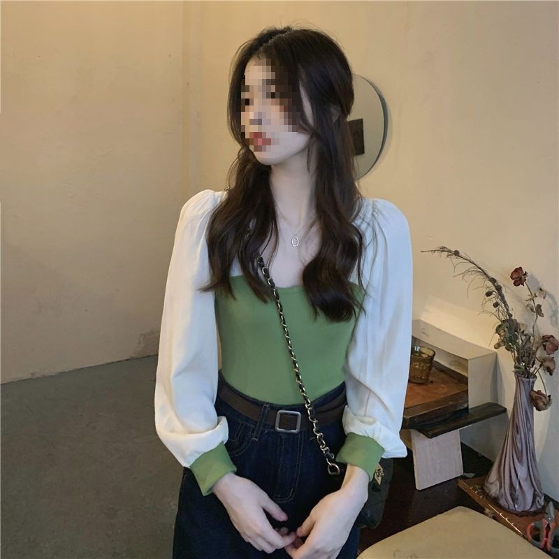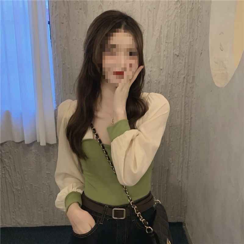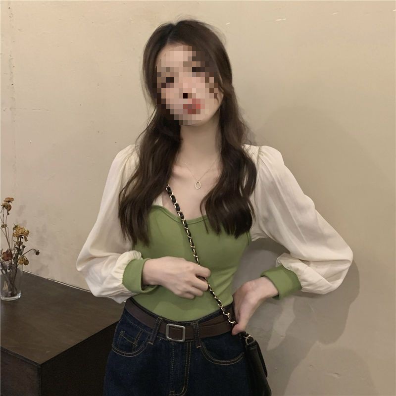 기질 짧은 바느질베이스 셔츠 여성의 이른 봄 새로운 디자인 센스 그린 슬림 핏 슬리밍 세련된 탑