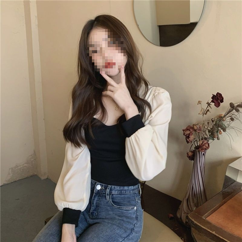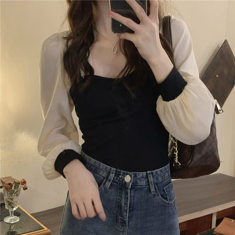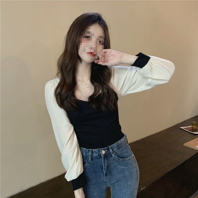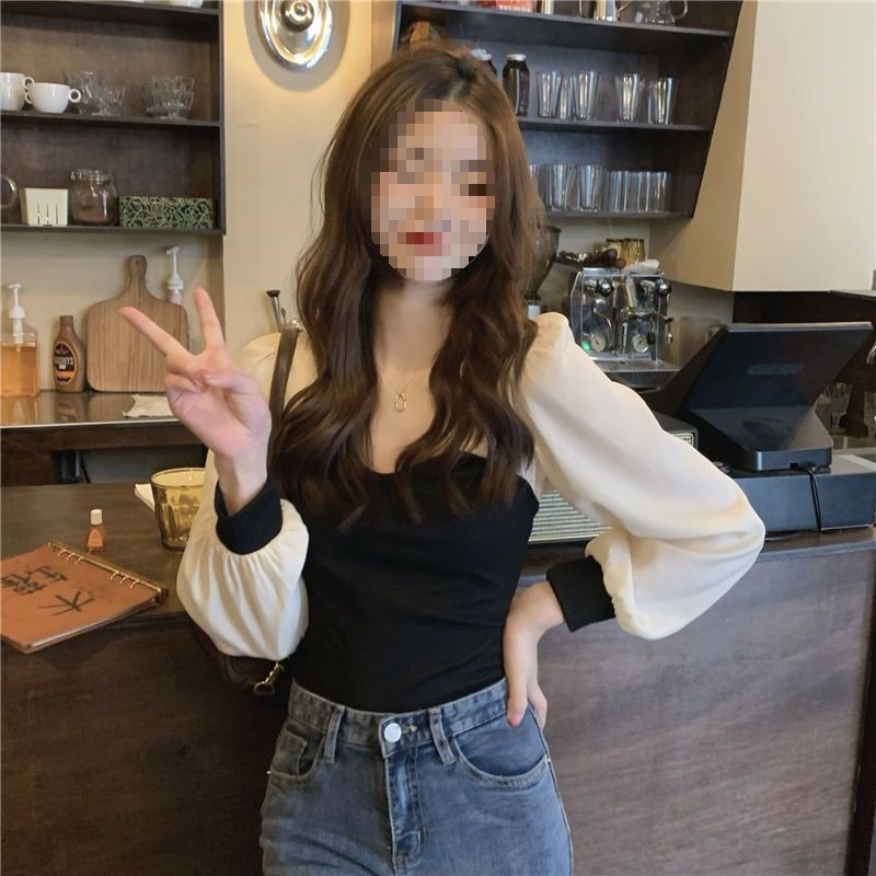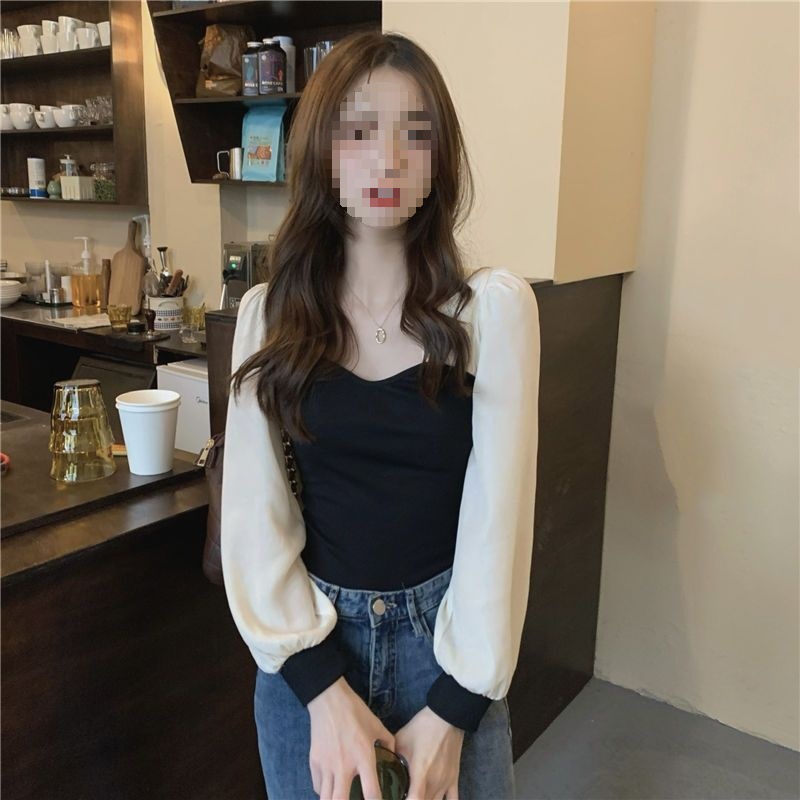 기질 짧은 바느질베이스 셔츠 여성의 이른 봄 새로운 디자인 센스 그린 슬림 핏 슬리밍 세련된 탑