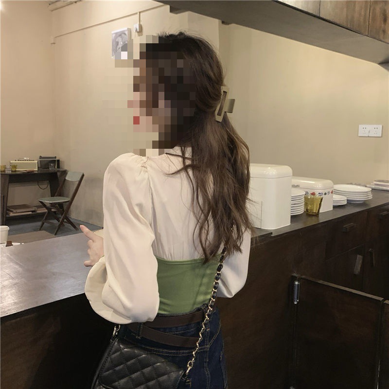 기질 짧은 바느질베이스 셔츠 여성의 이른 봄 새로운 디자인 센스 그린 슬림 핏 슬리밍 세련된 탑스토어 가기