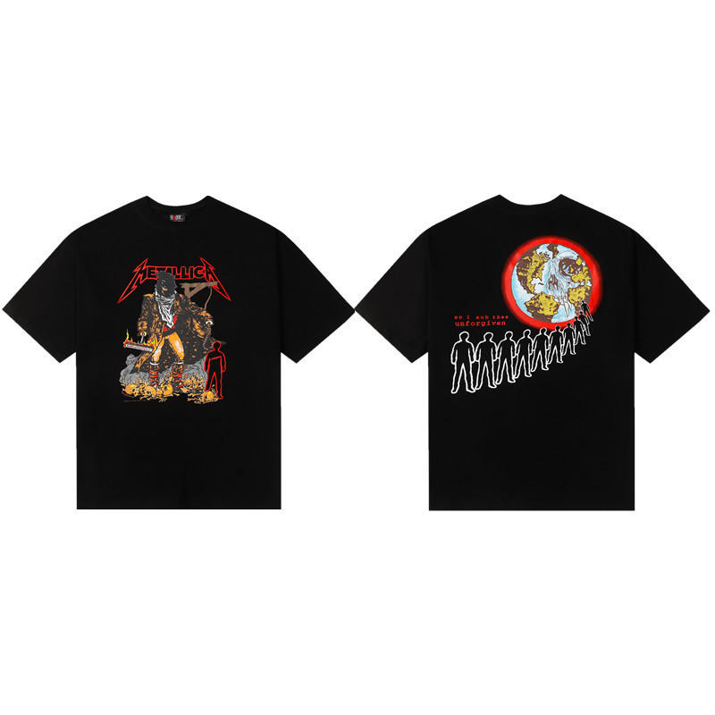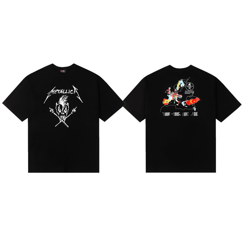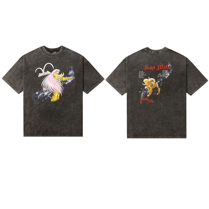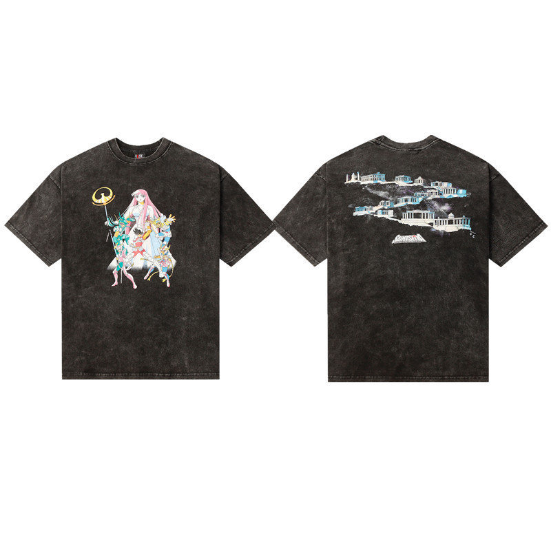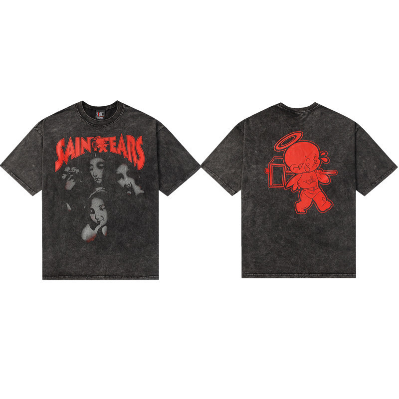 2024 미국 트렌디 브랜드 만화 문자 인쇄 캐주얼 남성과 여성 반팔 느슨한 커플 하이 스트리트 라운드 넥 티셔츠 대외 무역