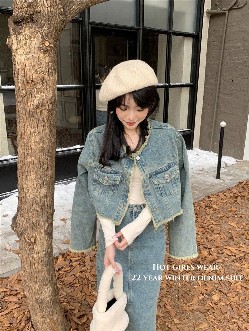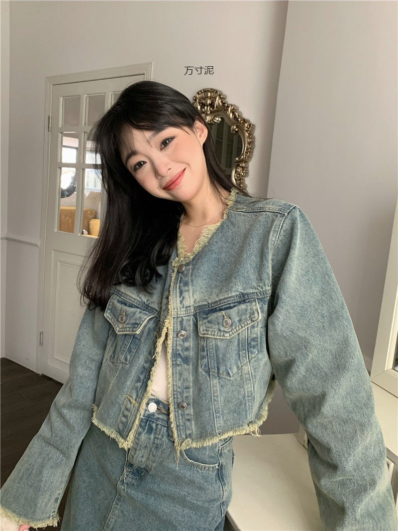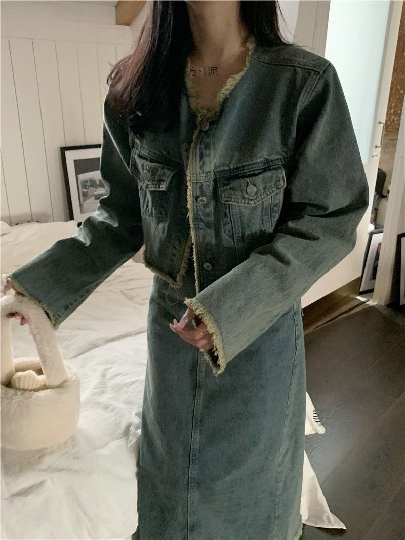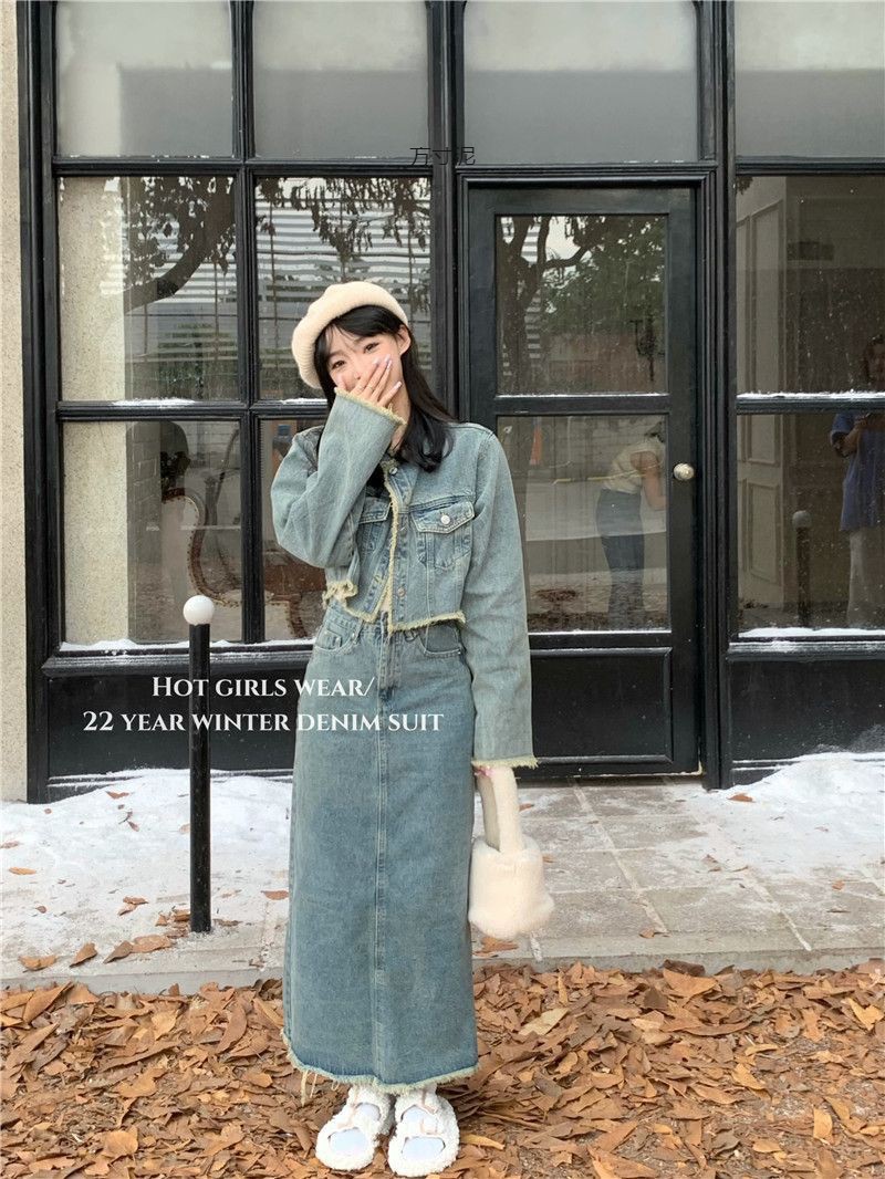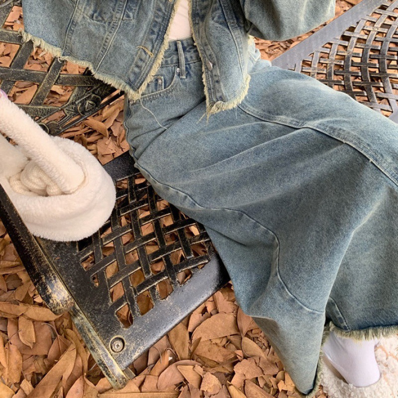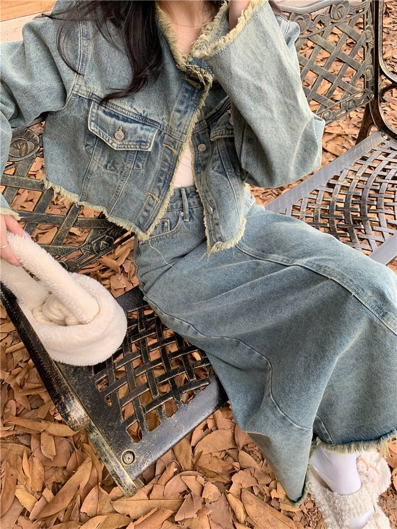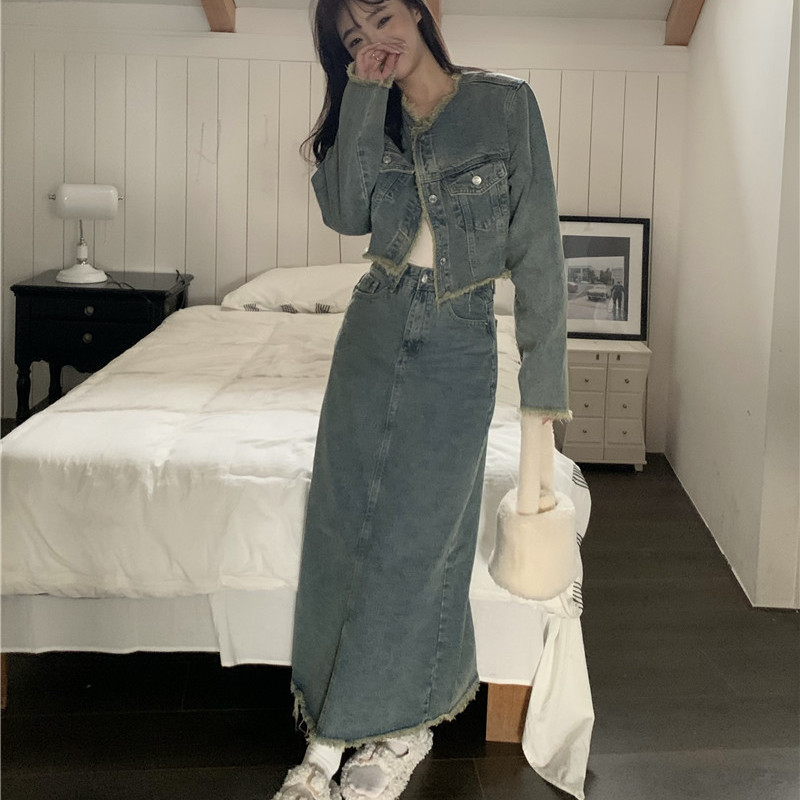 향신료 소녀 빈티지 세탁 짧은 데님 재킷 봄 2024 새로운 높은 허리 긴 치마 데님 스커트 세트
