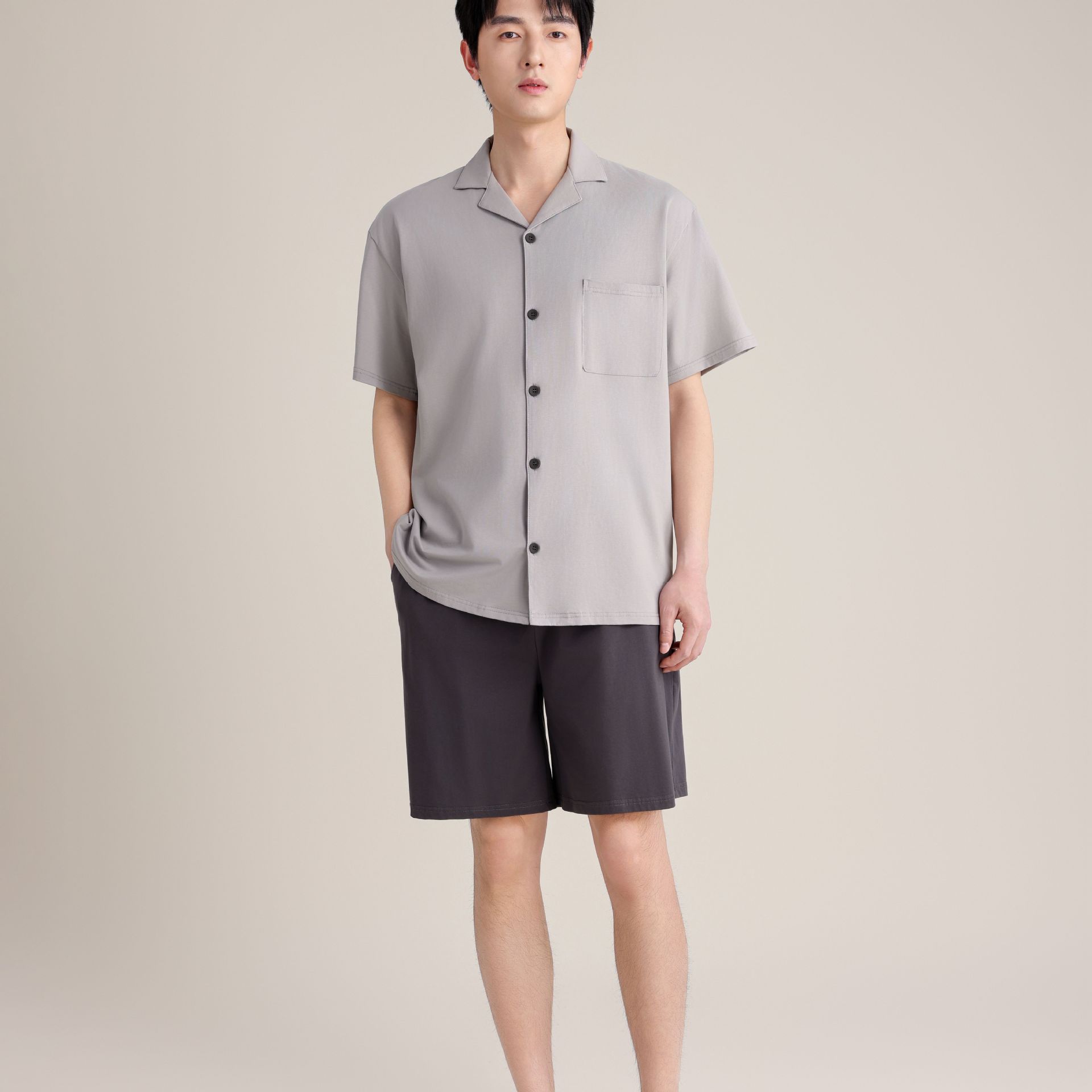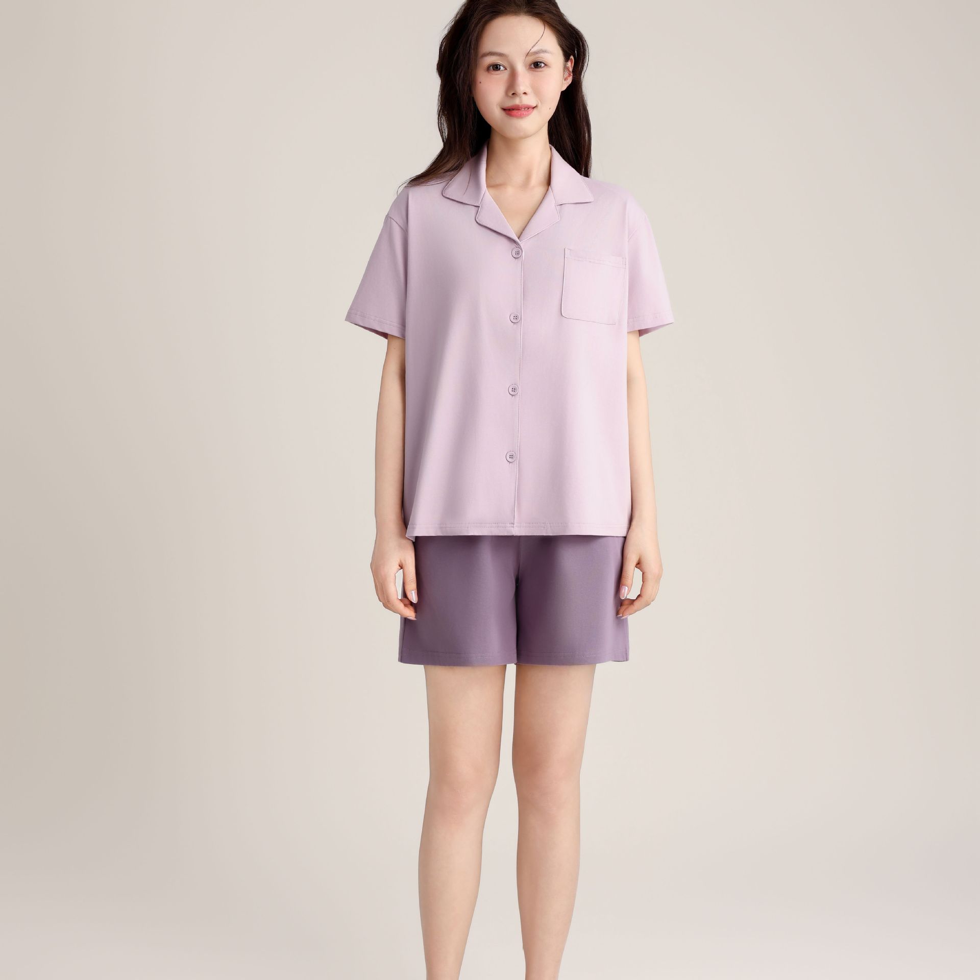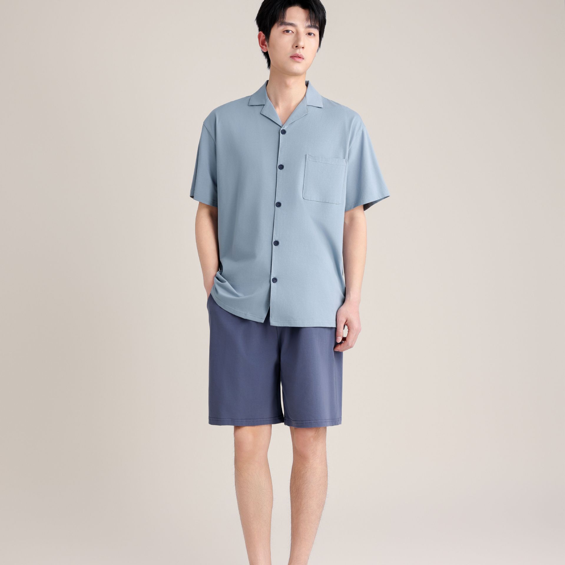 여름 잠옷 여성의 여름 통기성 땀 흡수 짧은 소매 커플의 부드러운 면 느슨한 홈 의류 여름 반바지 세트 남성스토어 가기