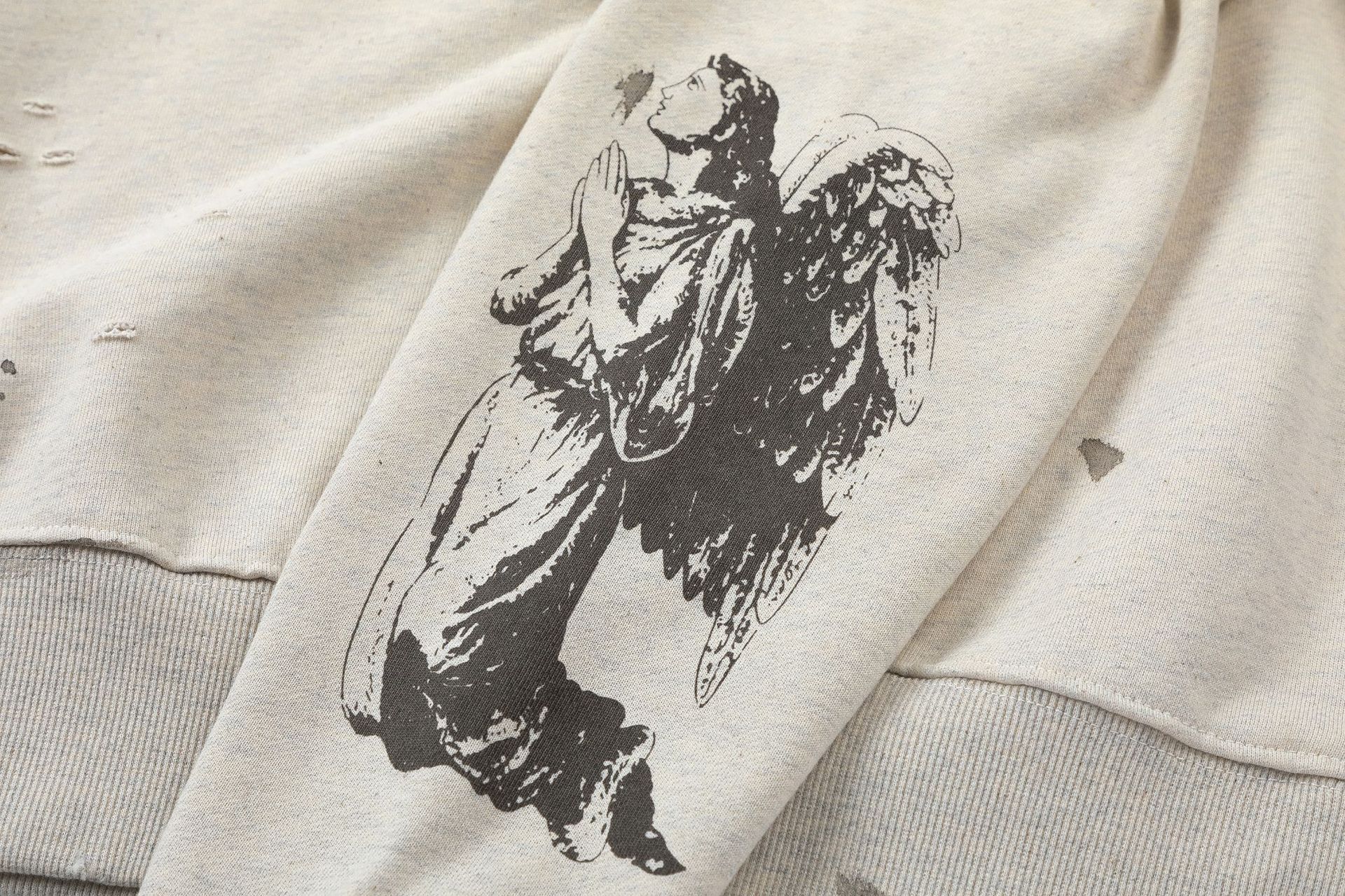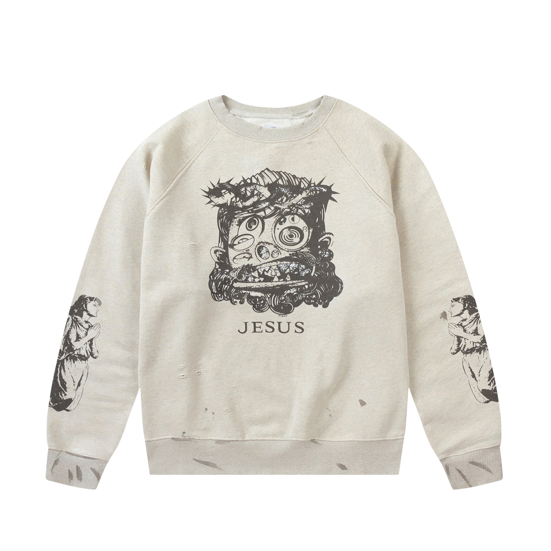 트렌디 한 브랜드 손으로 그린 낙서 인쇄 복고풍 손상 세척 오래된 둥근 목 스웨터 가을과 겨울 남성과 여성의 대외 무역 도매스토어 가기