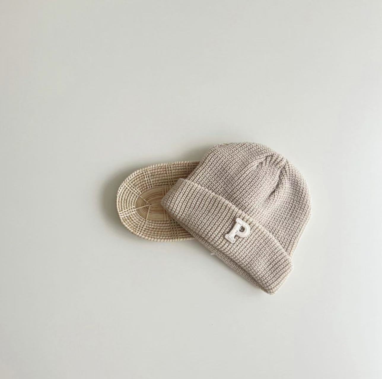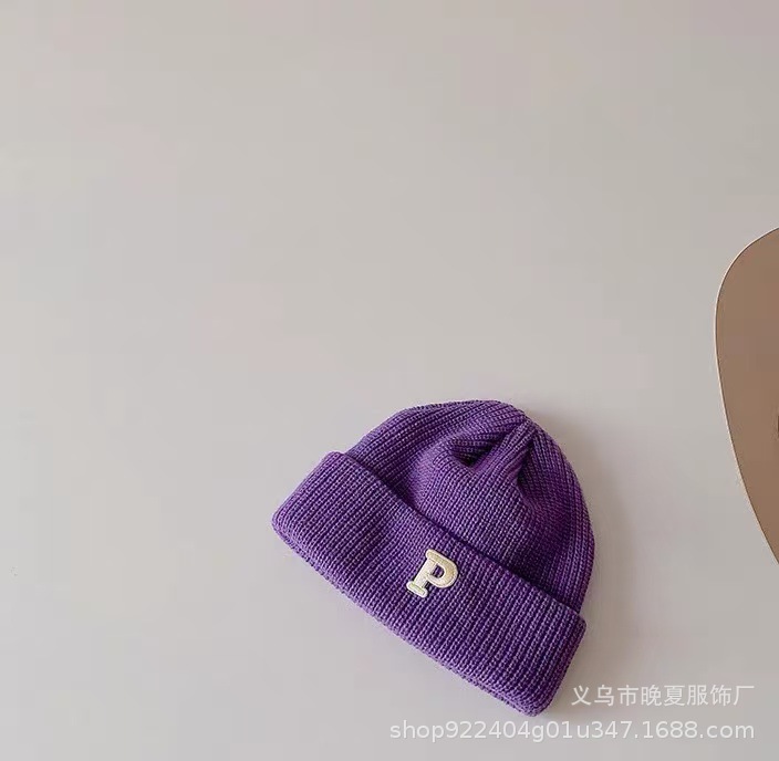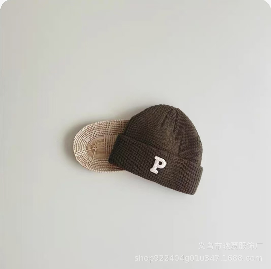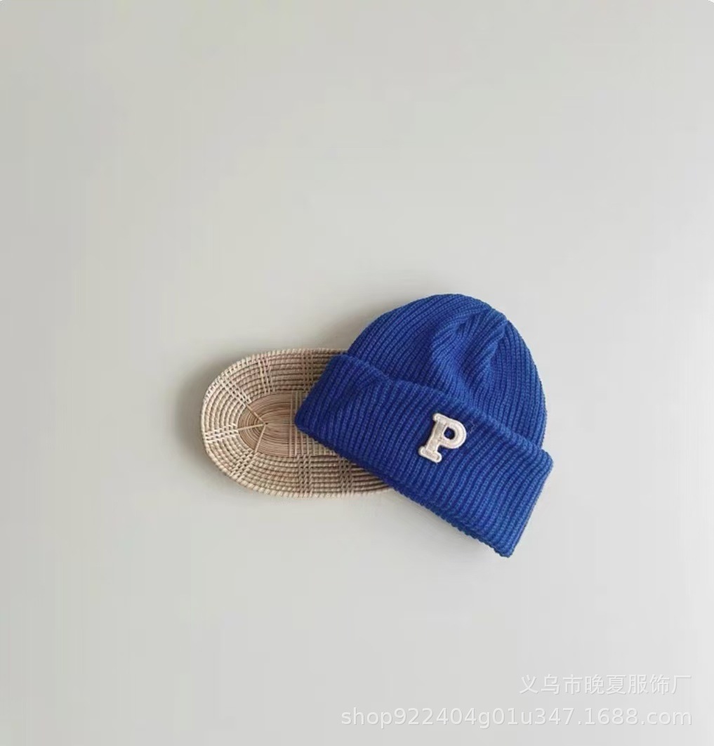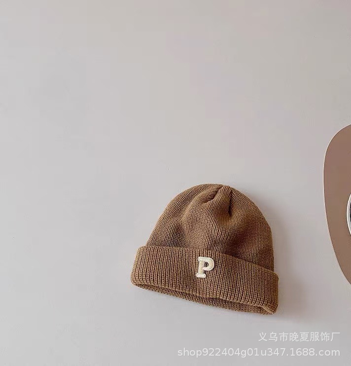 Ins 아기 니트 모자 플립 모자 따뜻한 올매치 가을 및 겨울 P 편지 소년 소녀를위한 단색 두꺼운 겨울 플립스토어 가기