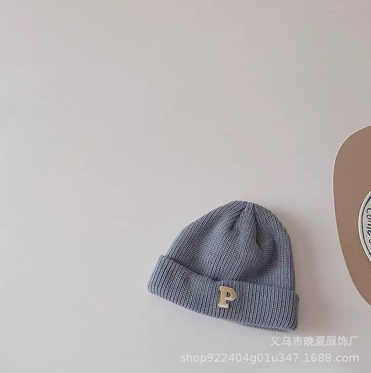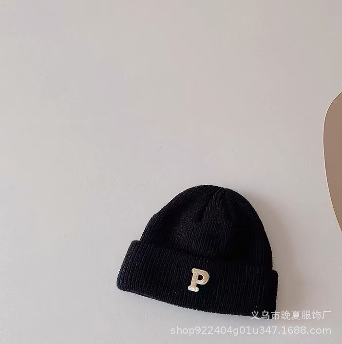 Ins 아기 니트 모자 플립 모자 따뜻한 올매치 가을 및 겨울 P 편지 소년 소녀를위한 단색 두꺼운 겨울 플립