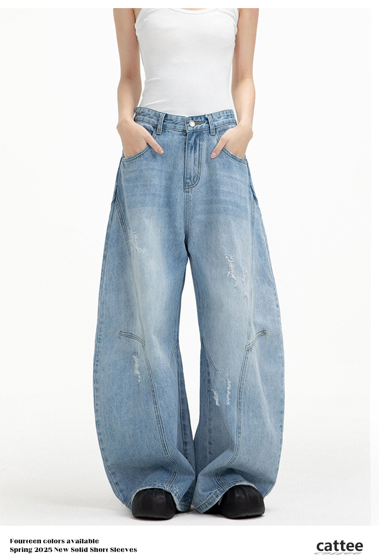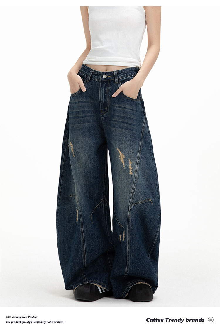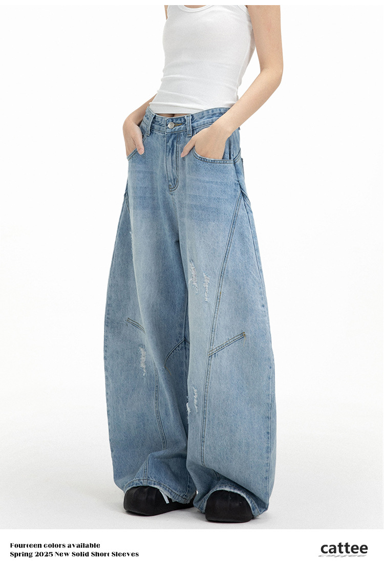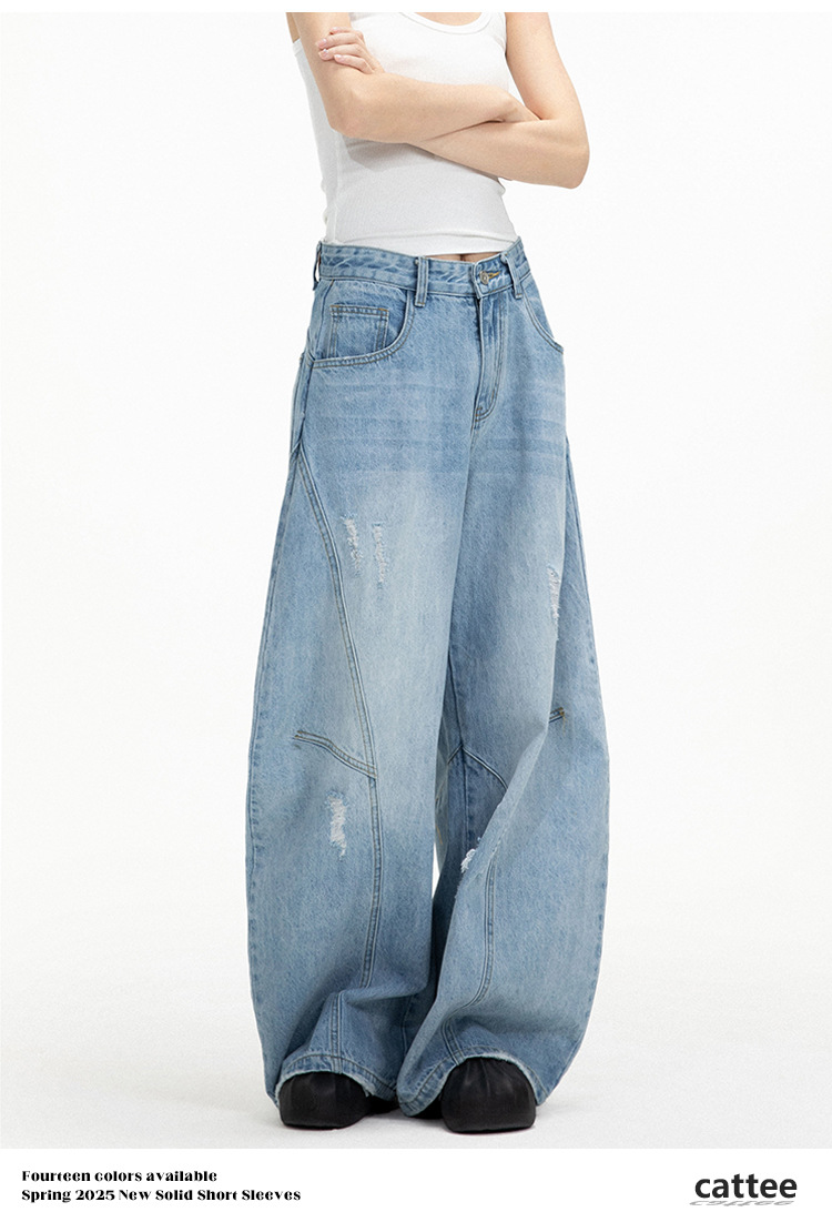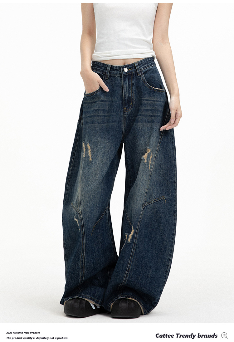 CATTEE 남성 아메리칸 스타일 빈티지 와이드 레그 청바지 남성과 여성의 봄과 가을 새로운 유행 브랜드 느슨한 캐주얼 바지