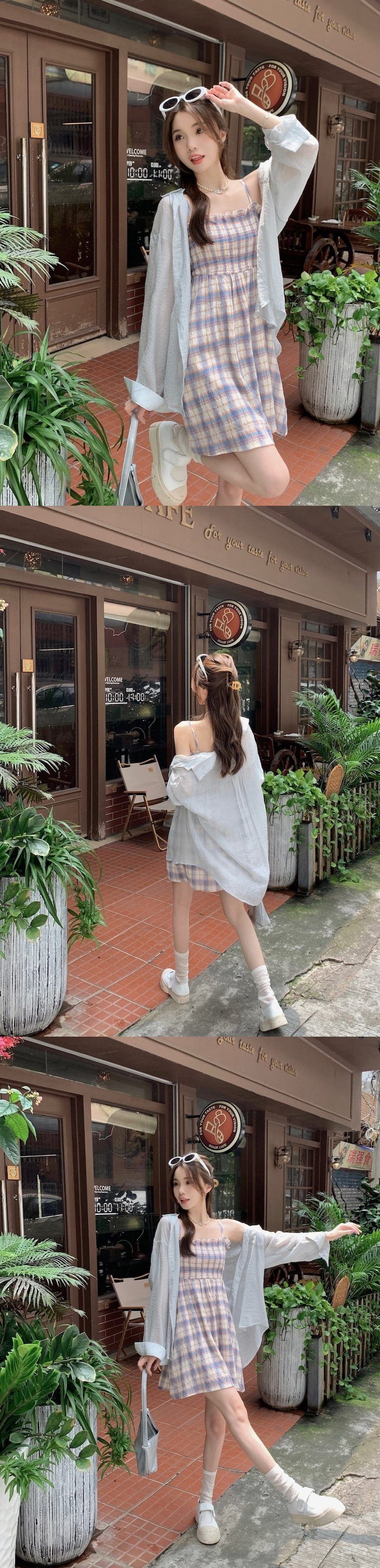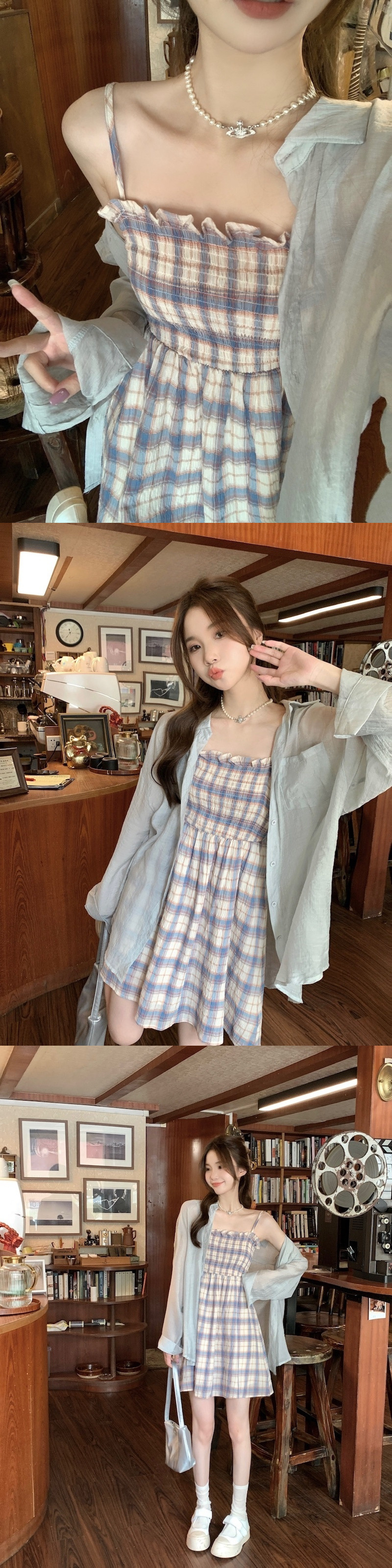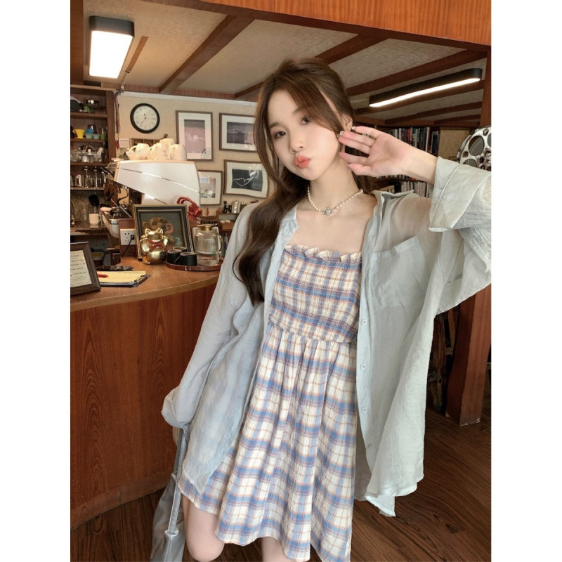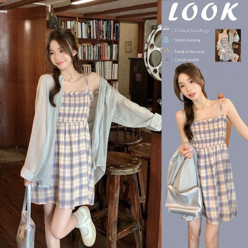 여름 부드러운 착용 여성의 2025 새로운 달콤한 시대 감소 선 스크린 카디건 격자 무늬 슬립 스커트 투피스 세트스토어 가기