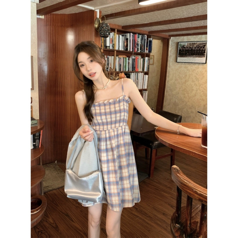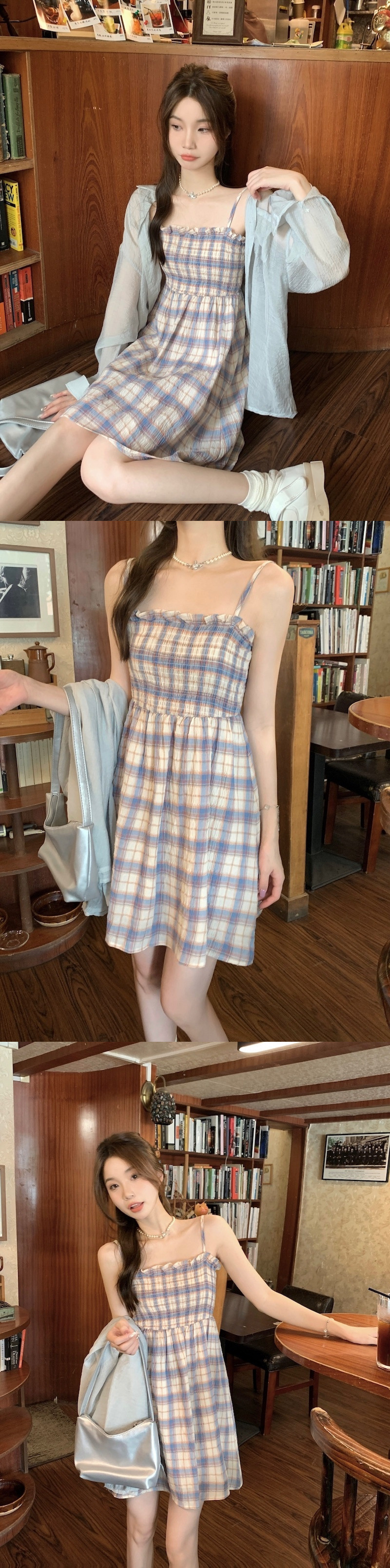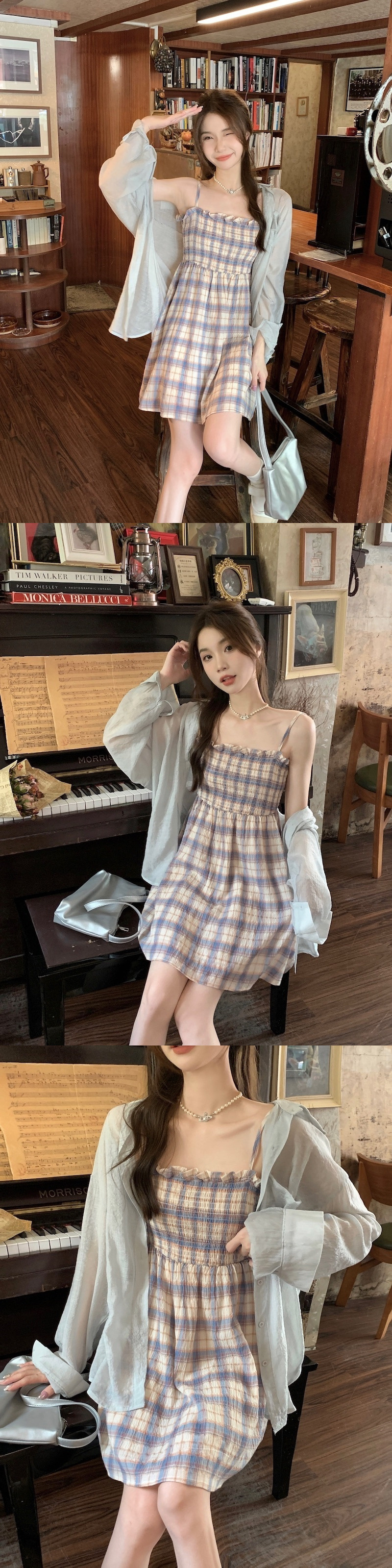 여름 부드러운 착용 여성의 2025 새로운 달콤한 시대 감소 선 스크린 카디건 격자 무늬 슬립 스커트 투피스 세트스토어 가기