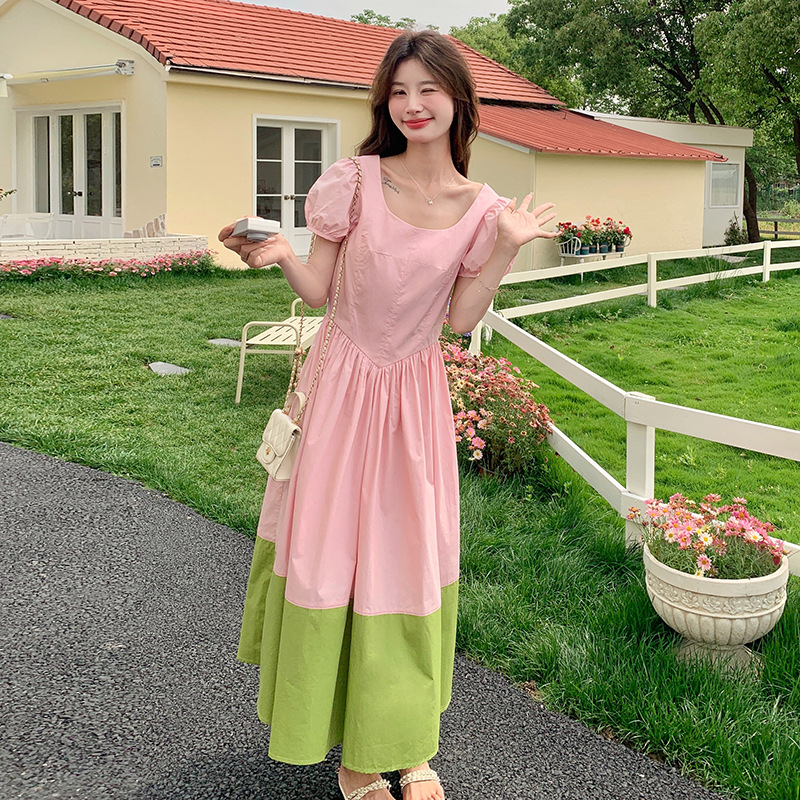 실제 샷 도파민 대비 색상 스티칭 원피스 2025 새로운 프랑스 복고풍 달콤한 간단한 허리 A 라인 스커트