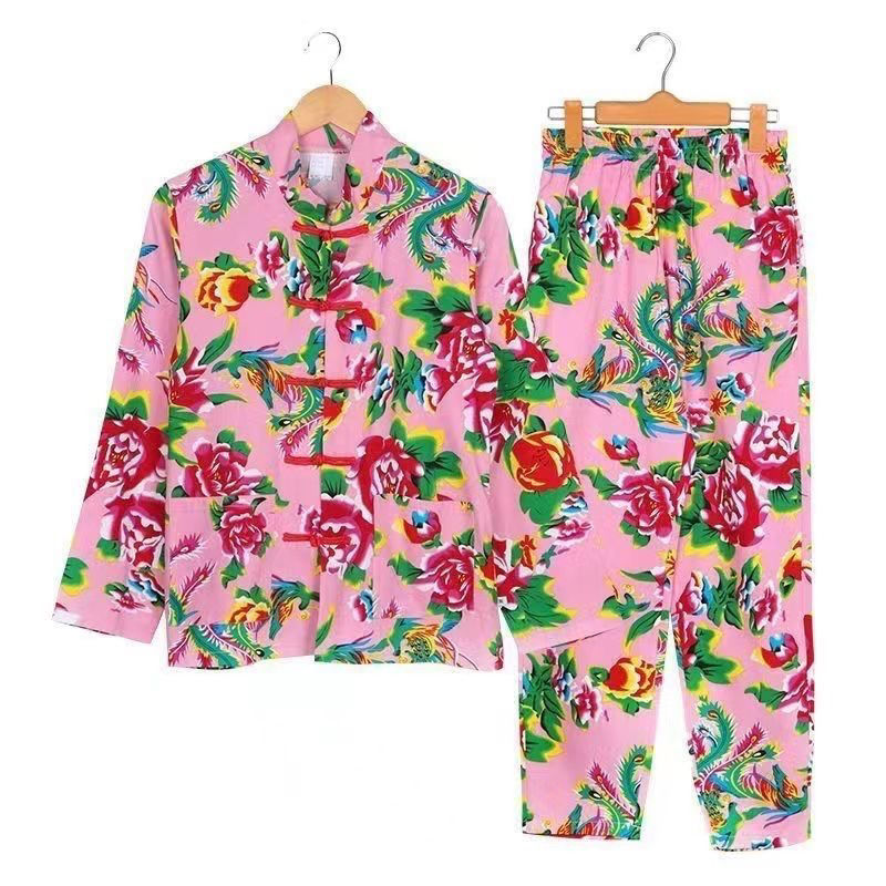 동북 꽃 천 세트 재미있는 코트 성인 셔츠 세트 인터넷 인기있는 트렌디 긴 소매 세트 중국 스타일스토어 가기