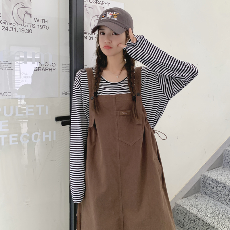 리얼 샷 다크 브라운 대학 스타일 일본 드로 스트링 스트랩 스커트 2025 느슨한 캐주얼 원피스 세트 새로운 한국어 버전