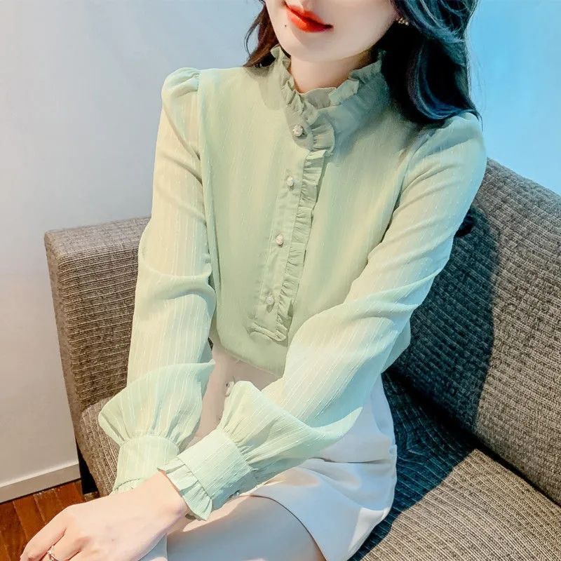 봄과 가을 2025 새로운 프랑스 쉬폰 셔츠 우아한 바느질 유행 칼라 바느질 긴팔 셔츠 여성스토어 가기
