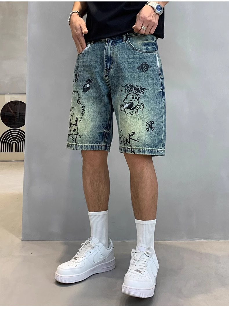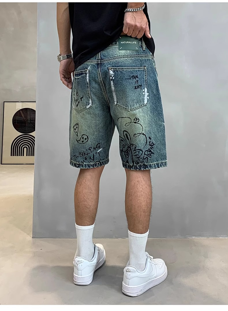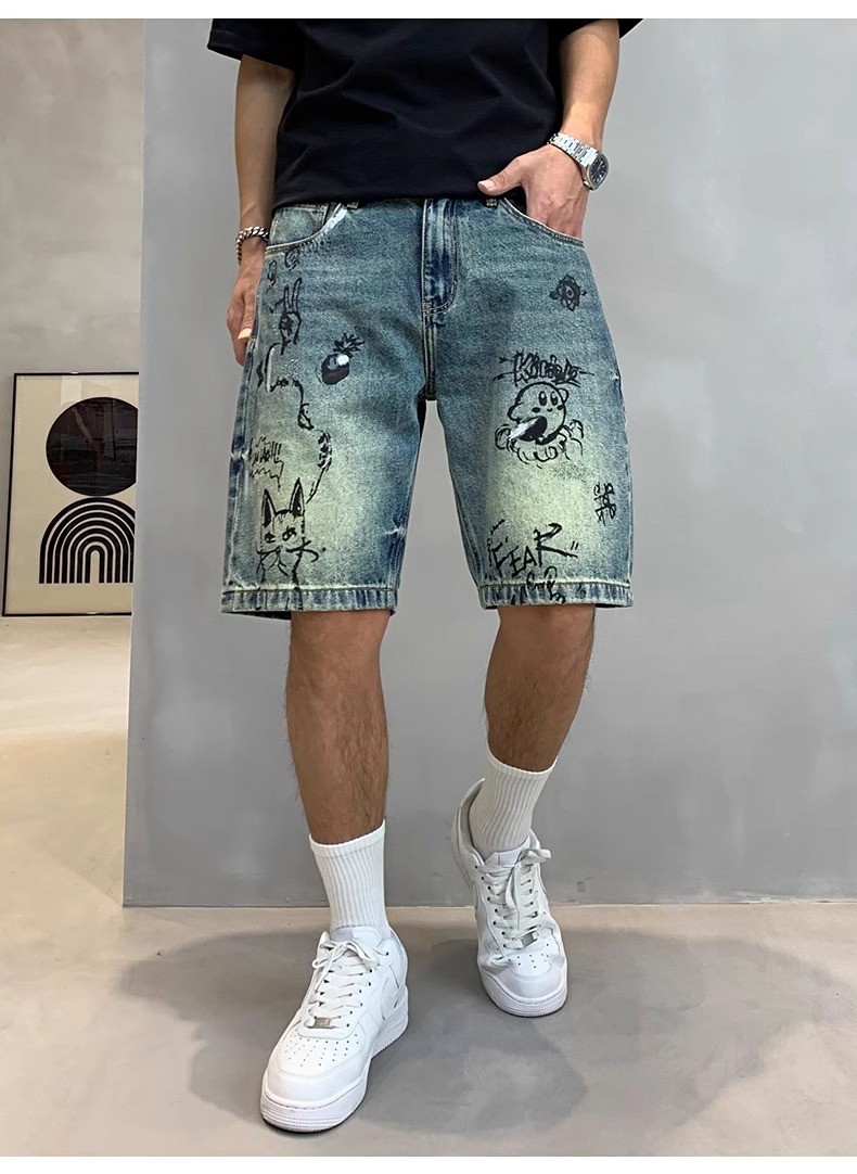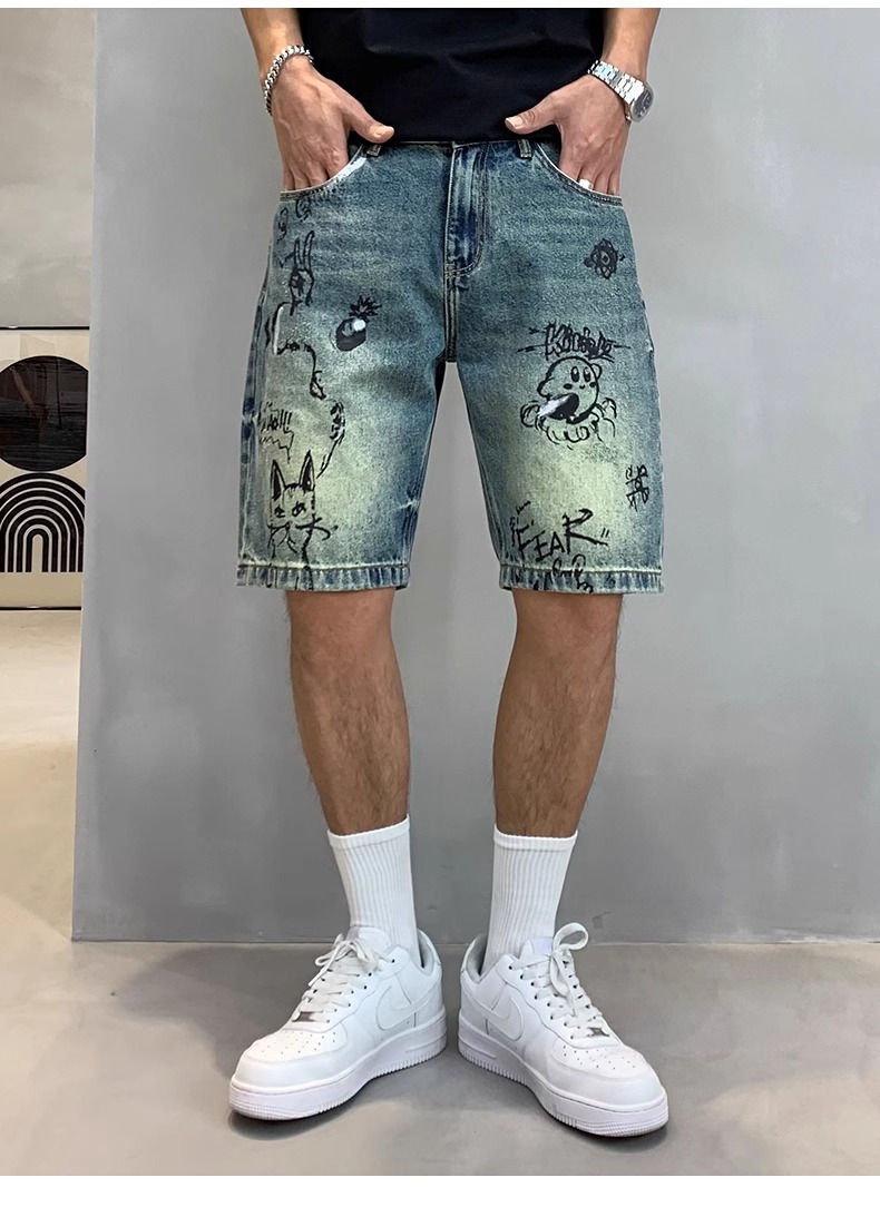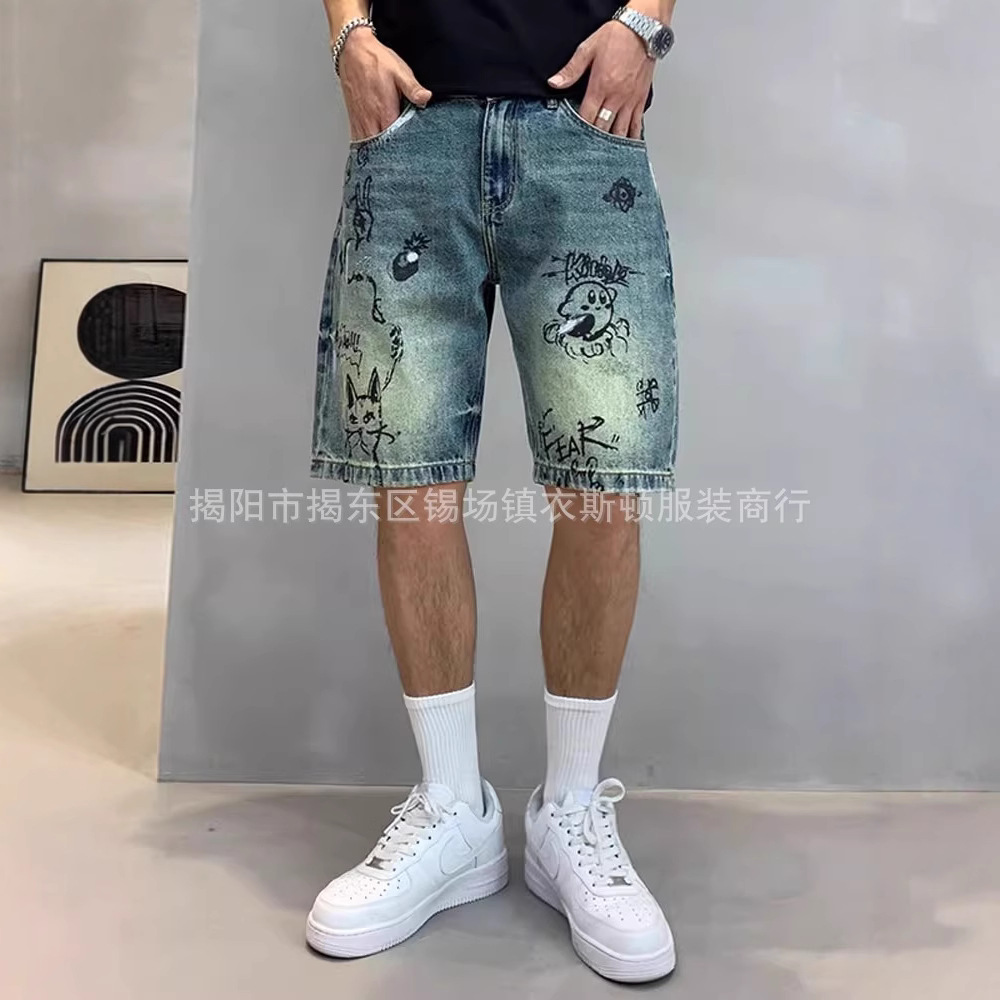 데님 반바지 남성용 얇은 미국 스타일 빈티지 낙서 인쇄 캐주얼 느슨한 아픈 씻은 중간 바지스토어 가기