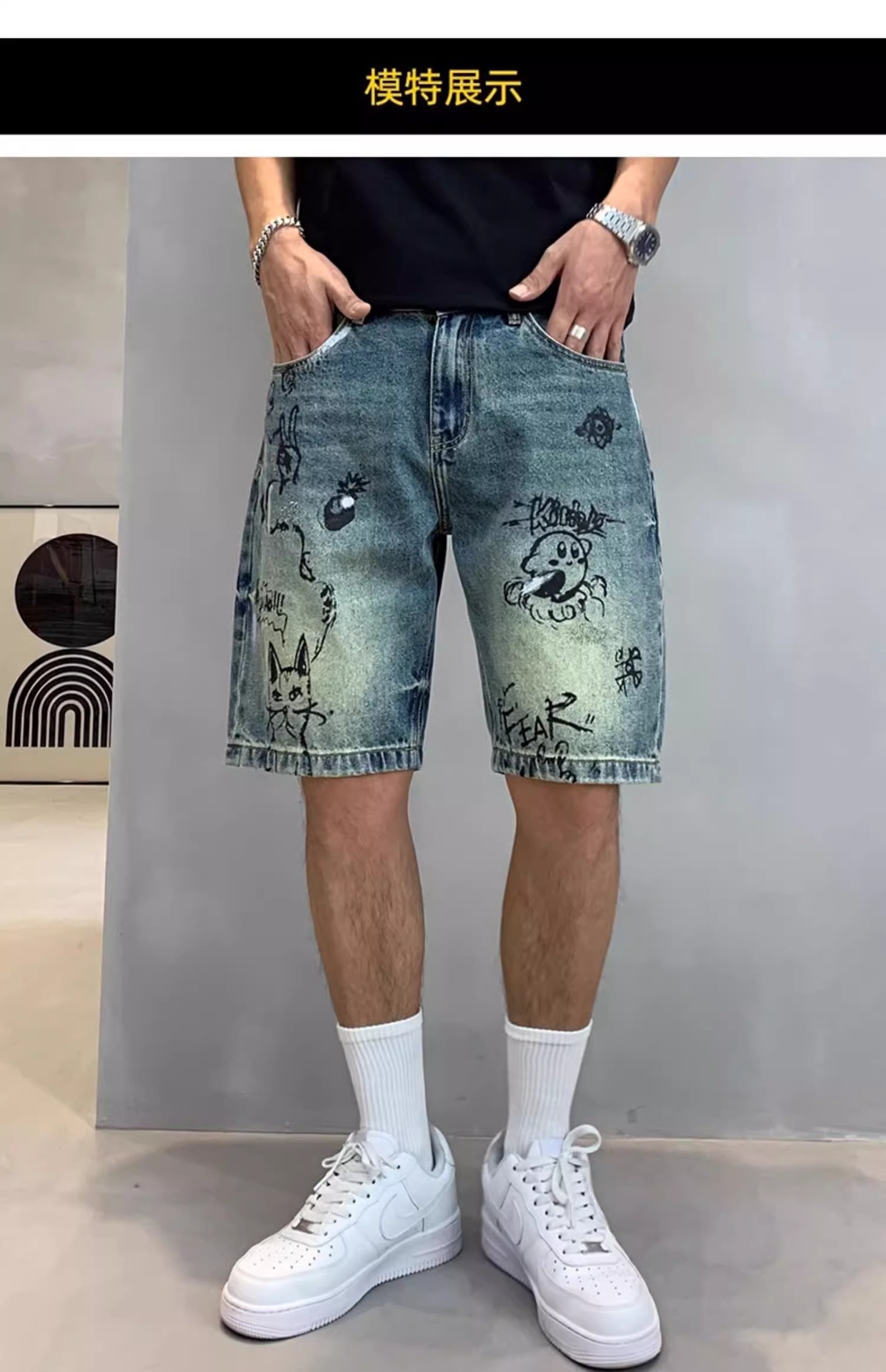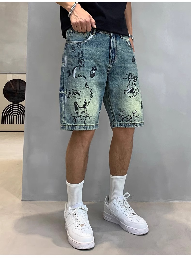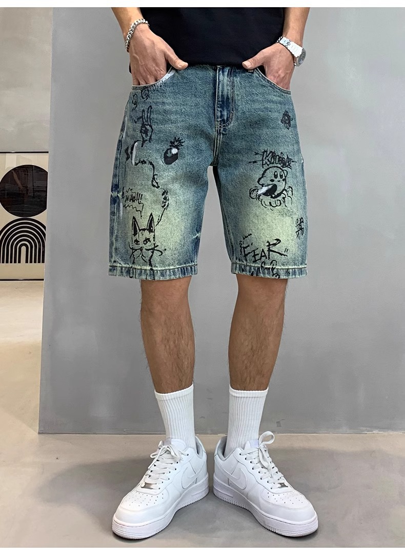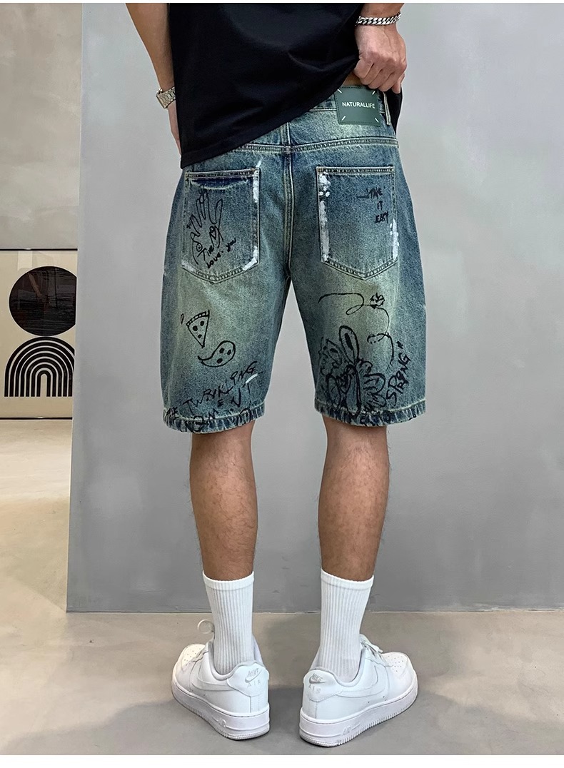 데님 반바지 남성용 얇은 미국 스타일 빈티지 낙서 인쇄 캐주얼 느슨한 아픈 씻은 중간 바지스토어 가기
