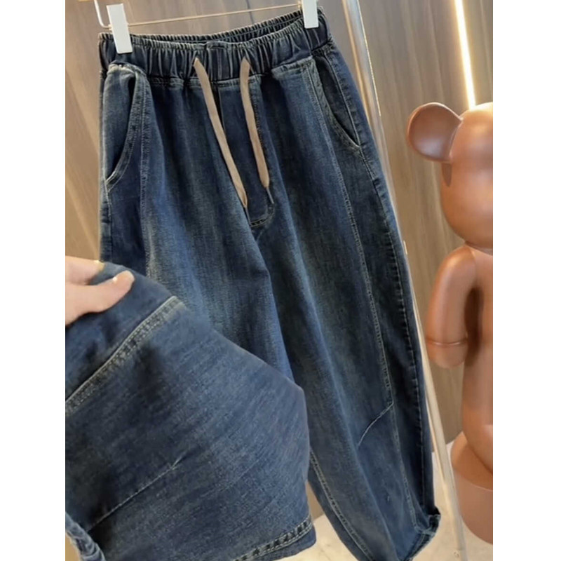 빈티지 플러스 사이즈 단색 드레이프 데님 할란 바지 가을 지방 300kg 고기 커버 슬림 탄성 허리 캐주얼 바지스토어 가기