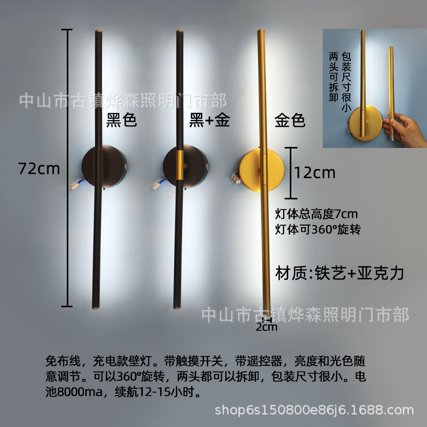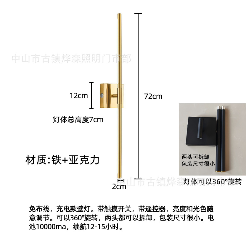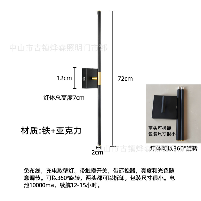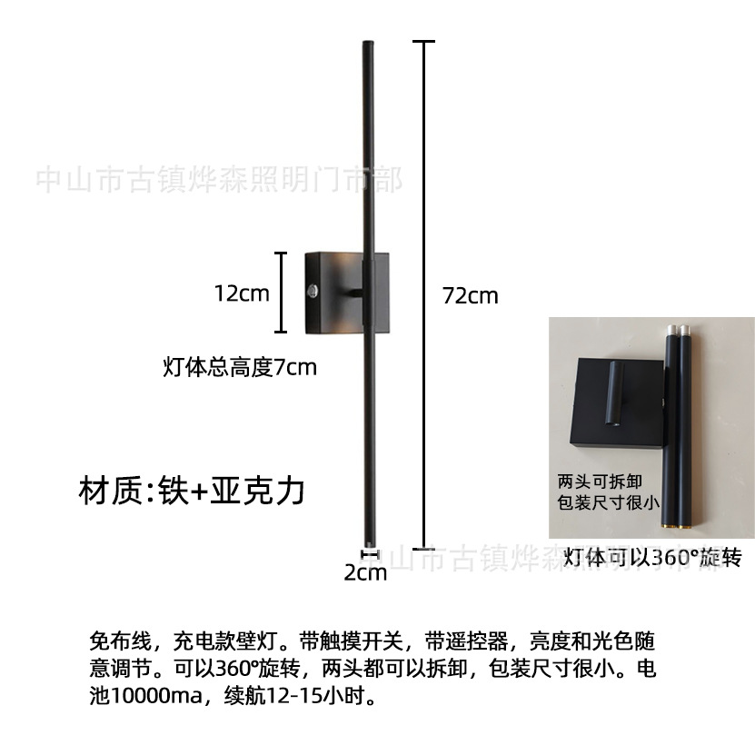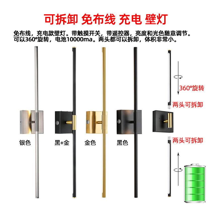 免布线,充电款壁灯。带触摸开关,带遥控器,亮度和光色随意调节。可以360°旋转,两头都可以拆卸,体积非常小。电池圆盘8000-方盘10000ma,可以续航12-40小时,最高亮度12-15小时,最低亮度35-40小时。