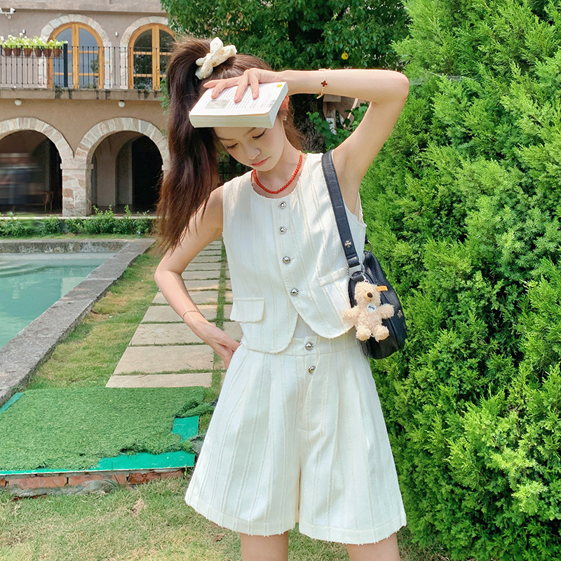 2025 세트 새로운 달콤한 민소매 조끼 넓은 다리 반바지 투피스 세트 실제 촬영 나이를 줄이는 질감 작은 향기로운 스타일