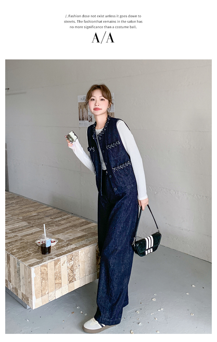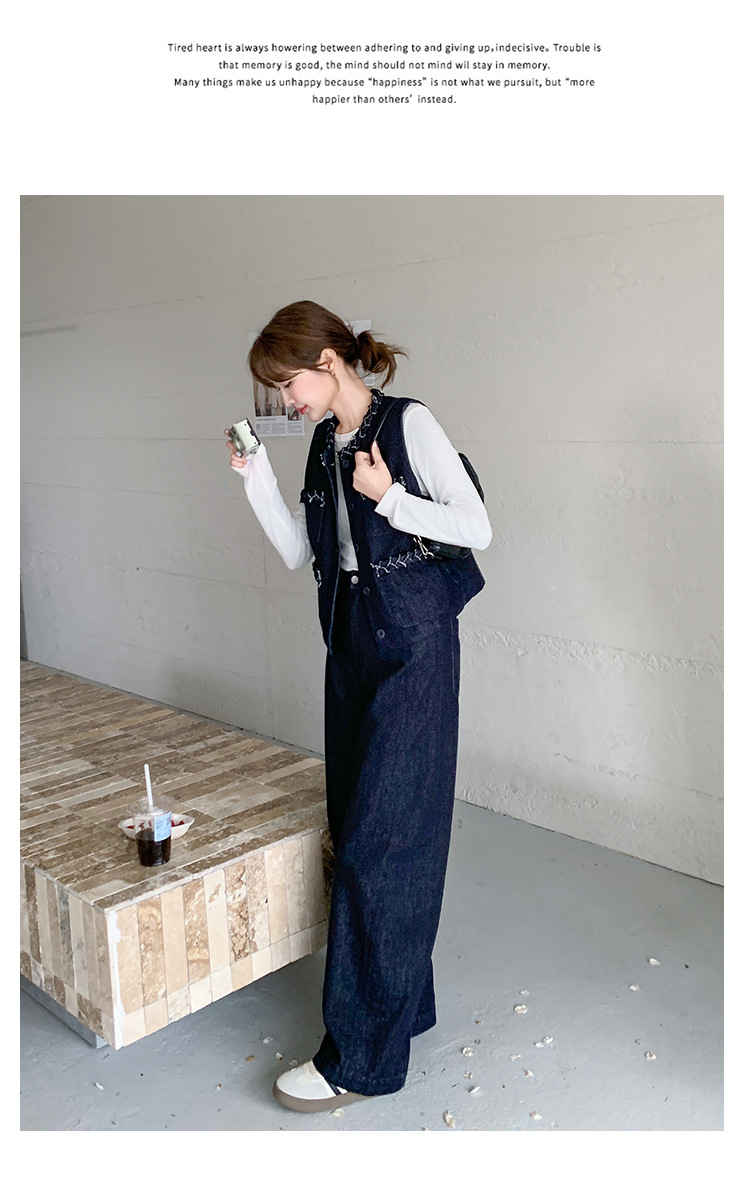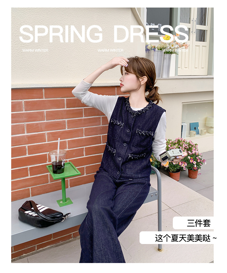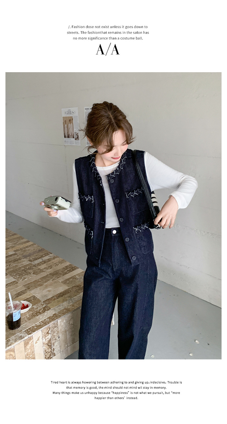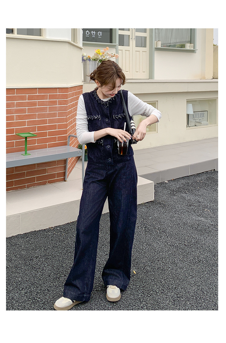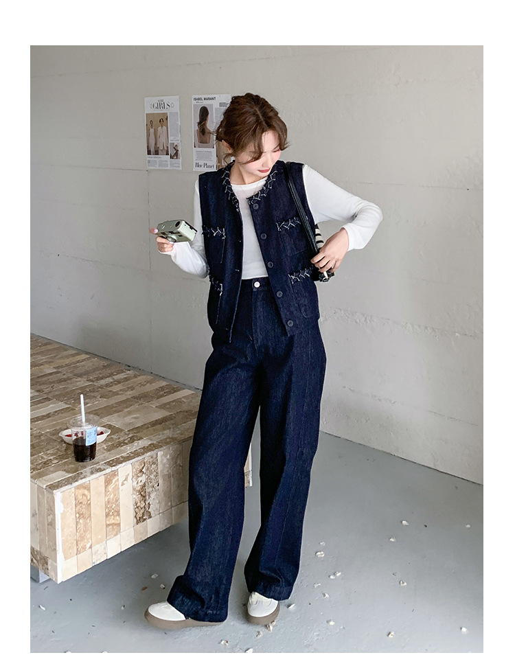 [멩메이] 25 스프링 다크 블루 스티칭 짧은 양복 조끼 느슨한 스트레이트 바지 세트 디자인 3 피스 세트