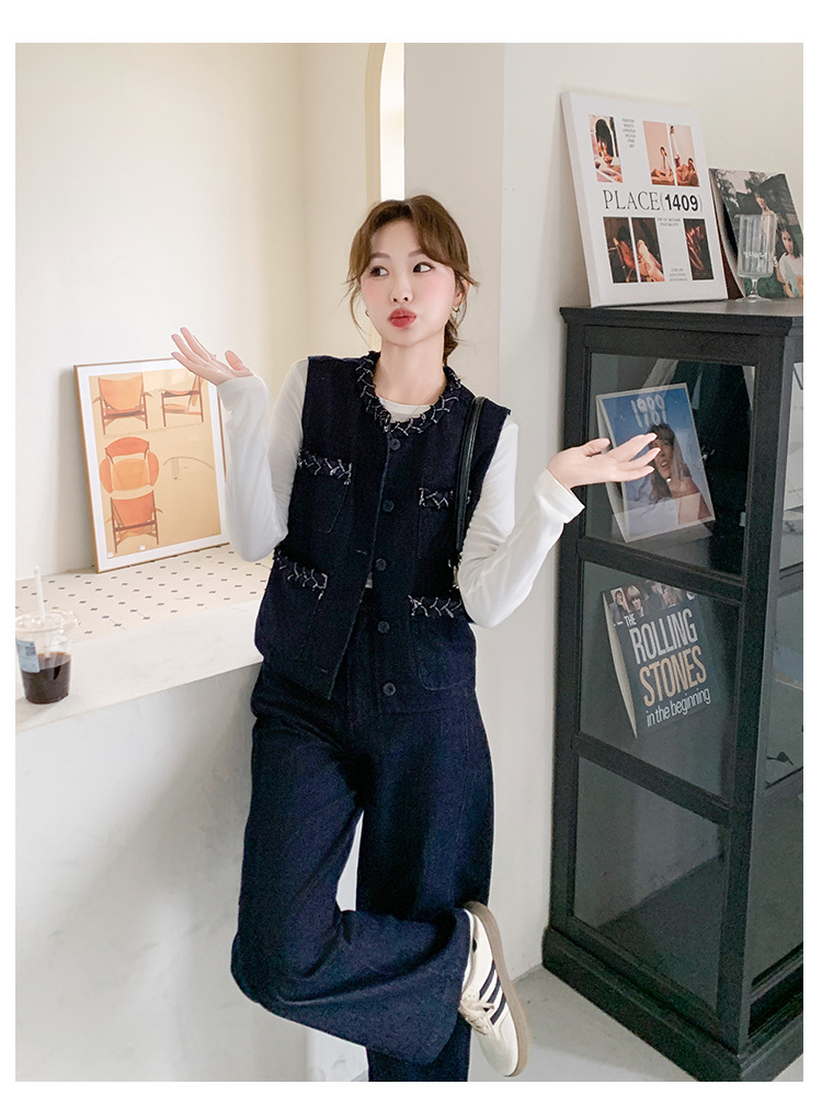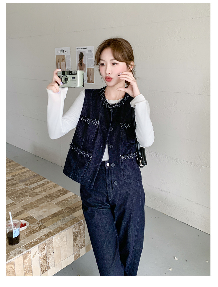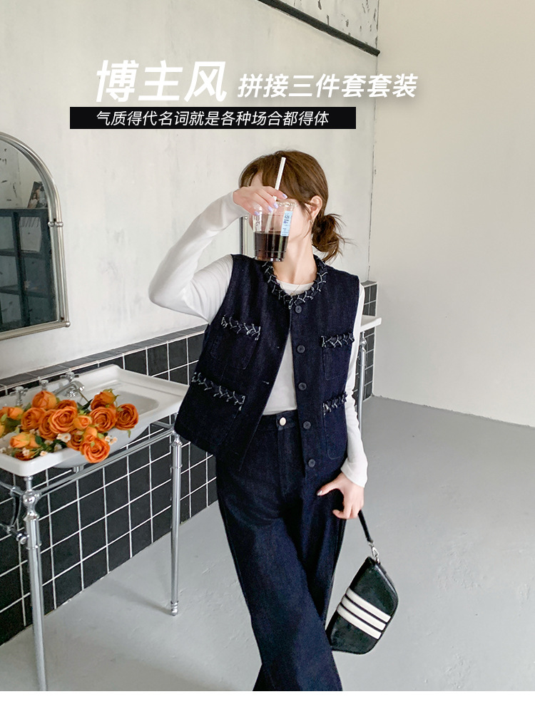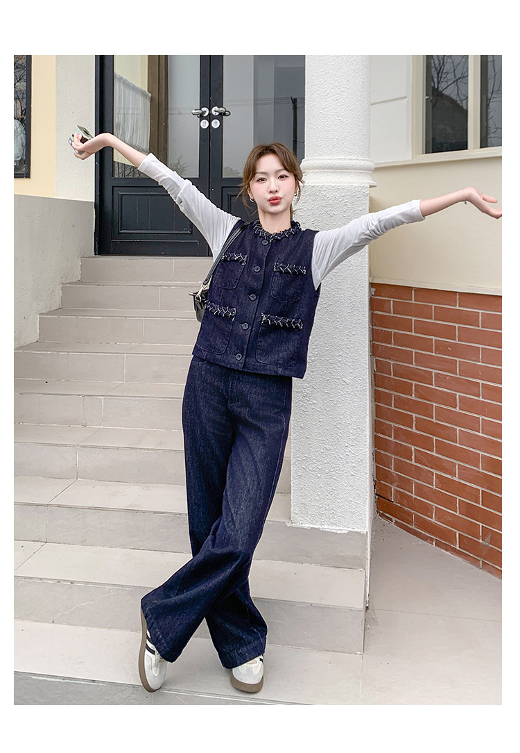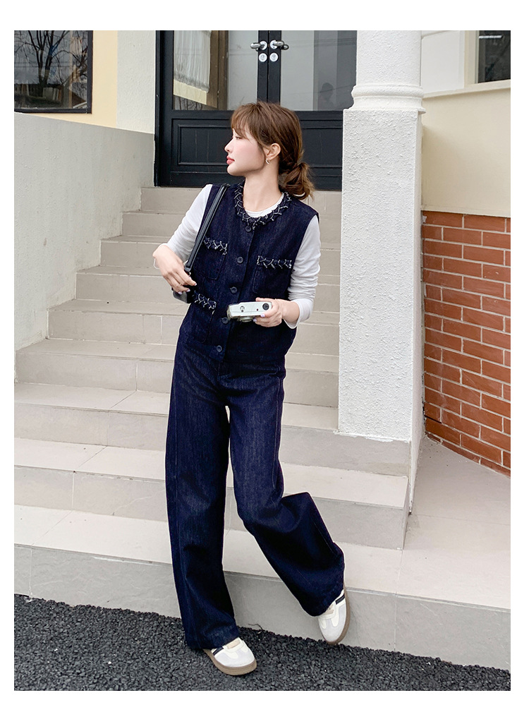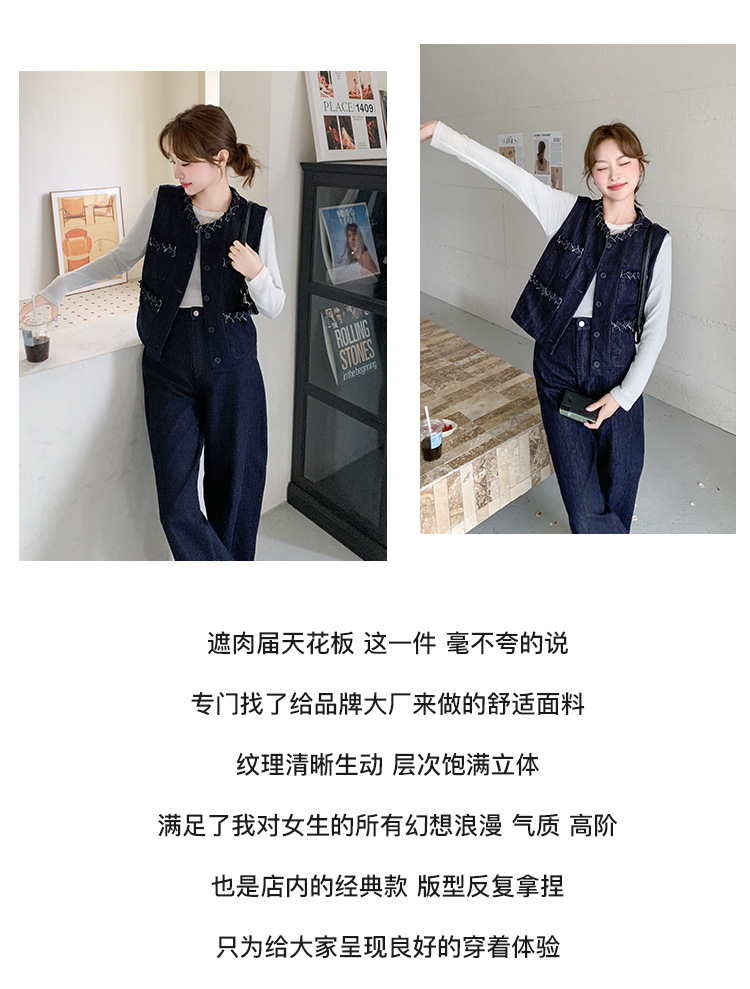 [멩메이] 25 스프링 다크 블루 스티칭 짧은 양복 조끼 느슨한 스트레이트 바지 세트 디자인 3 피스 세트